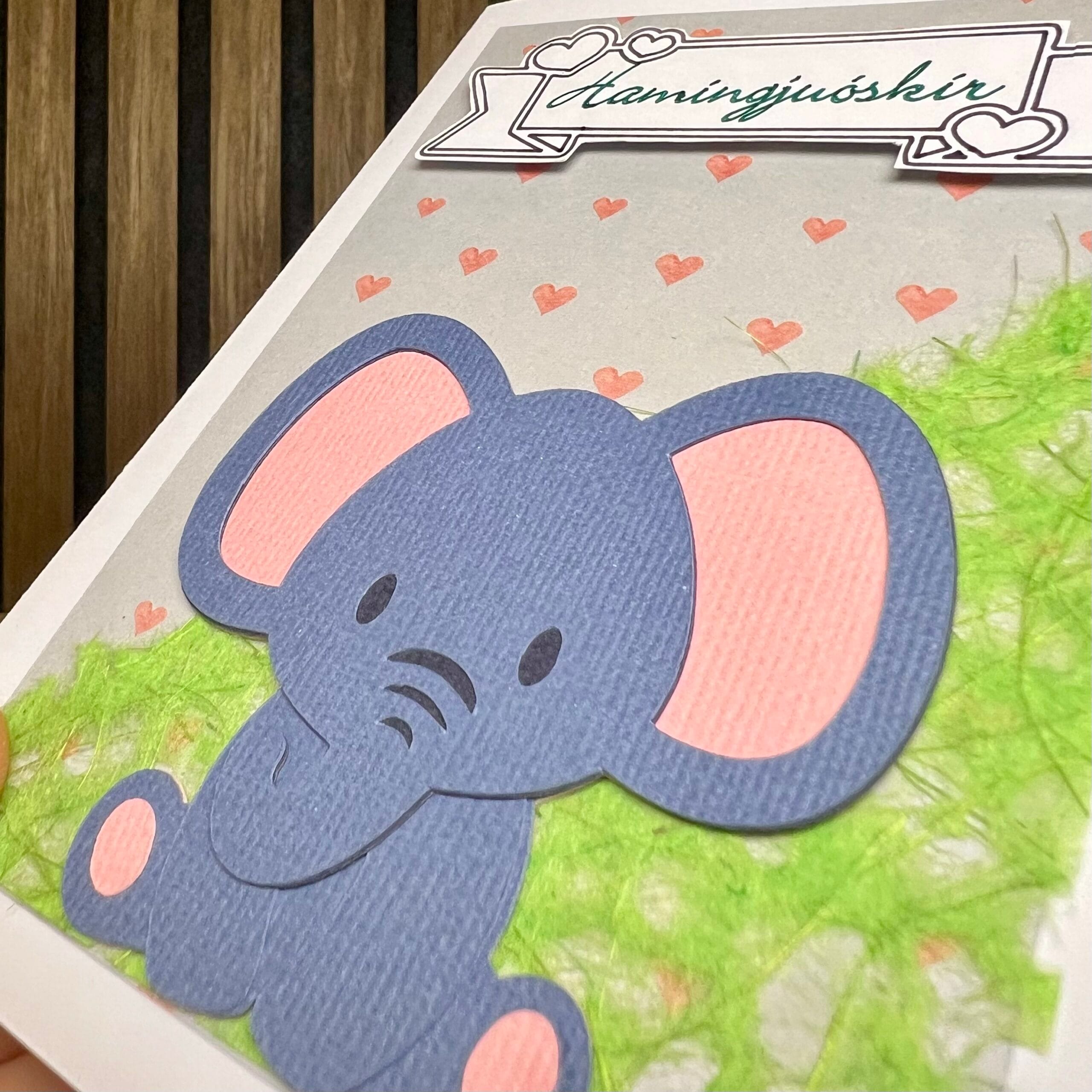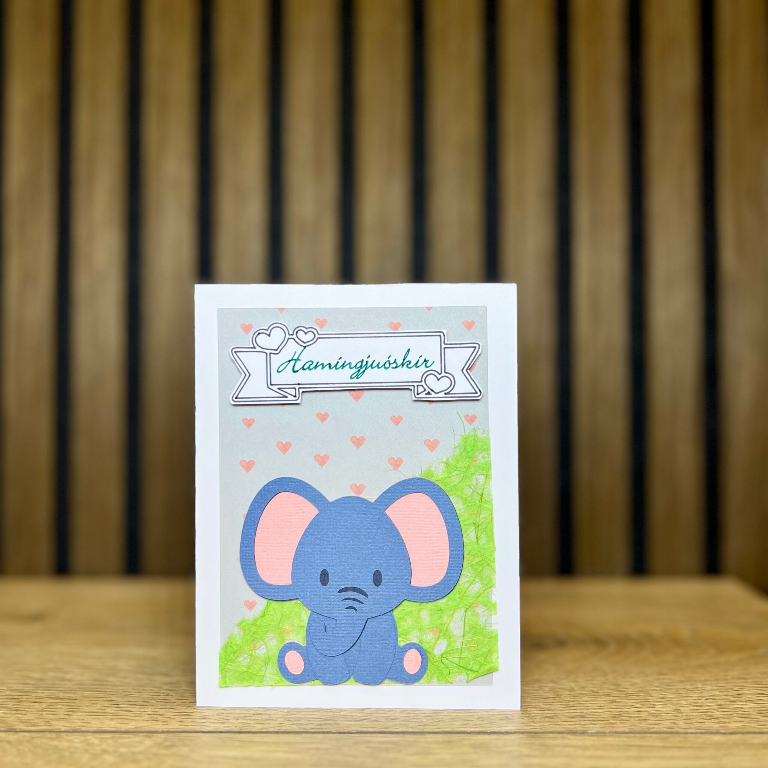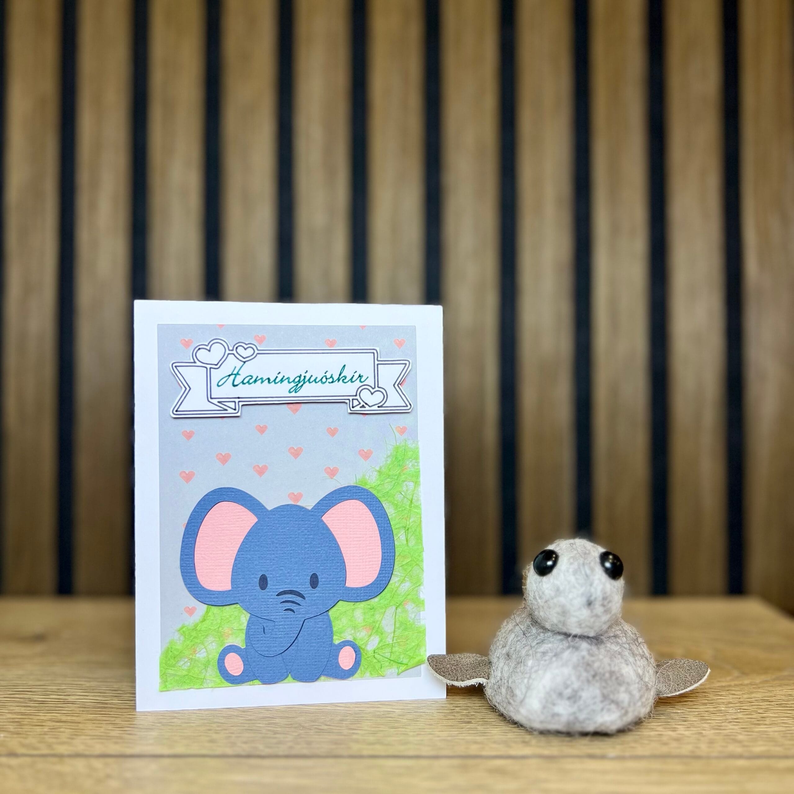 Þetta heillandi handgerða 3D barnakort er hannað til að færa gleði og bros! Á forsíðunni er fallegt fílabarn gert með þrívíddartækni sem gerir myndina líflega og tjáningarríka. Fíllinn með stóru góðlegu augun, leikandi upphleyptan ranann og mjúku pastellitina skapa notalegt og gleðilegt andrúmsloft.