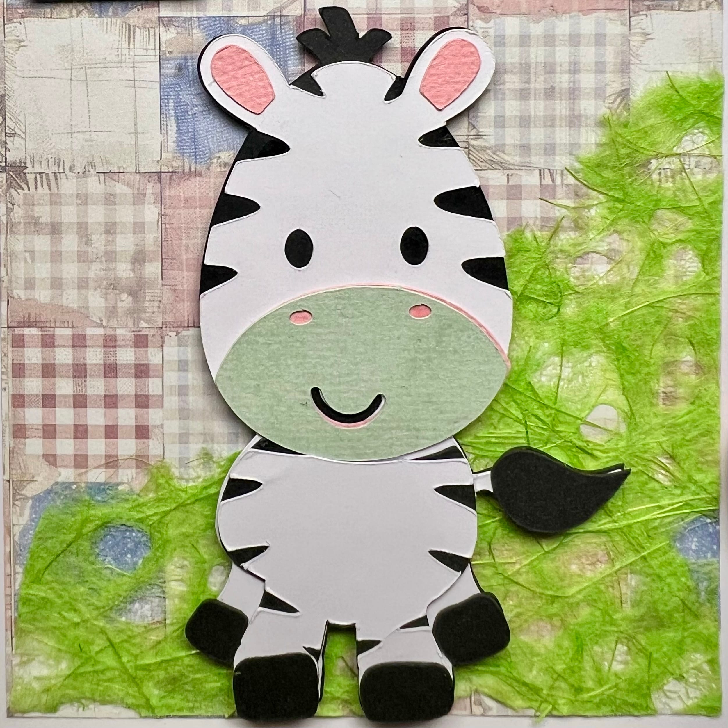 Skreyting úr áferð græns pappírs gefur kortinu sérstakan sjarma og skapar áhrif suðræns gróðurs þar sem sebran leikur sér. Þrívíddareiginleikar og hlýlegar, óvenjulegar smáatriði gera kortið einstakt og eftirminnilegt.