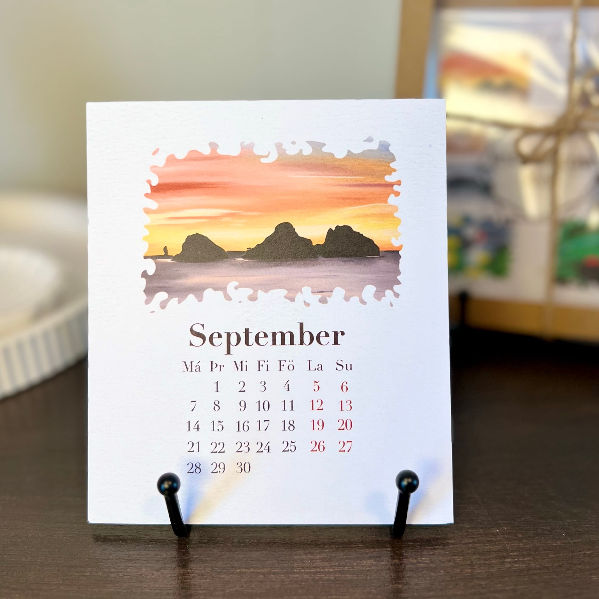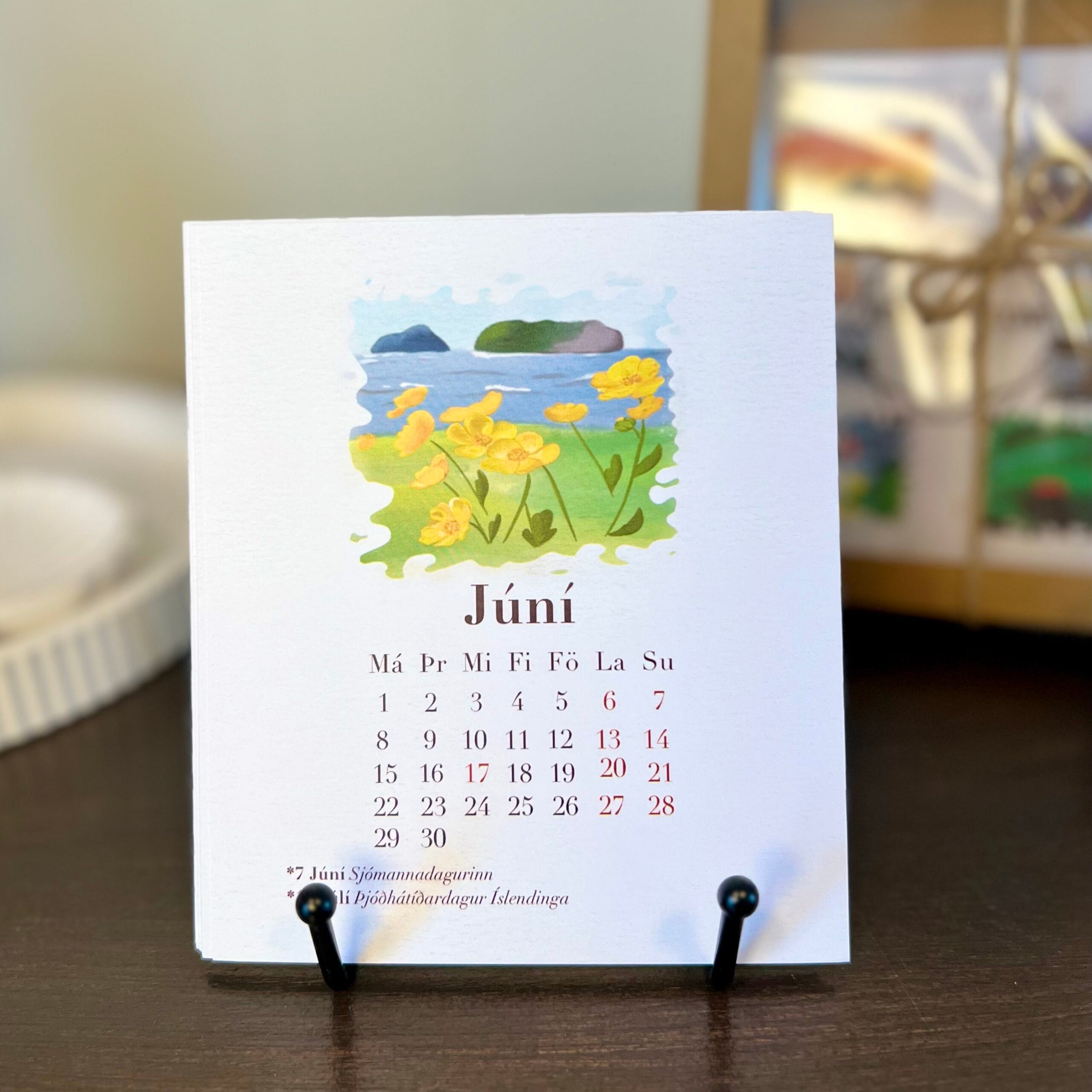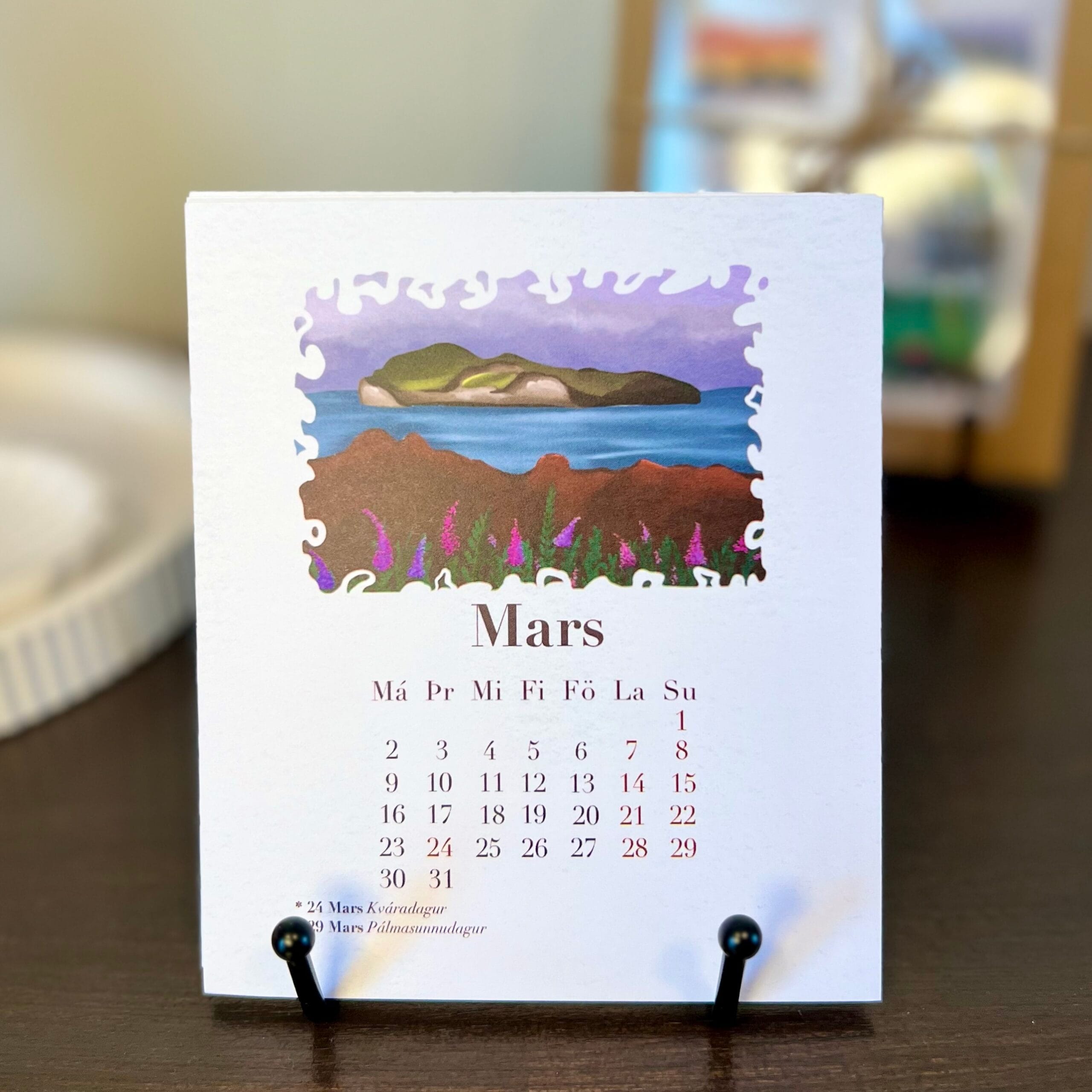 Hver mánuður sýnir upprunalega teikningu innblásna af ástsælum stöðum eyjunnar — allt frá kyrrlátum hornum til hrífandi útsýna sem gera Vestmannaeyjar svo sérstakar.
