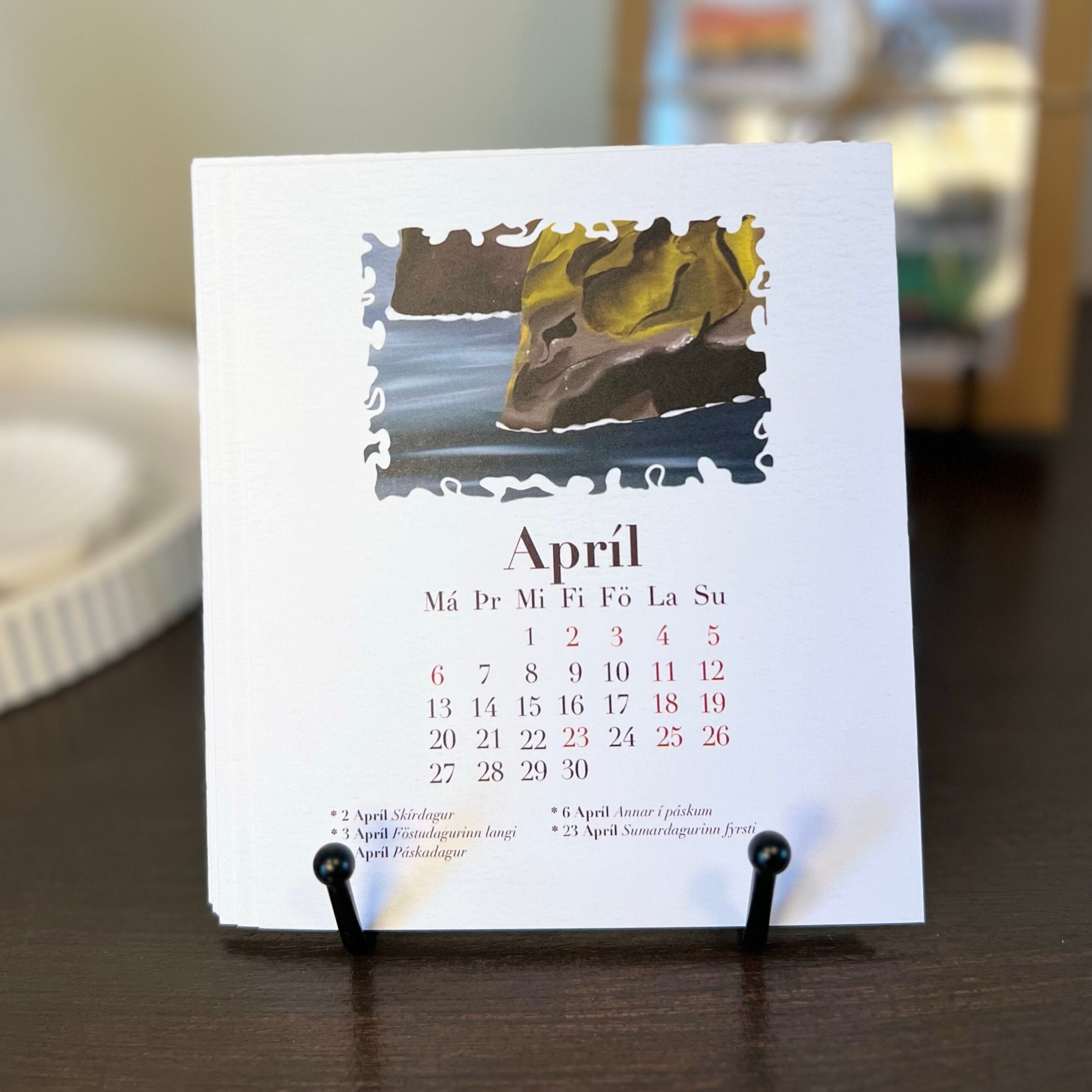 Dagatalið er hannað sem safn stakra spjalda (stærð 12 × 14 cm) prentuð á hágæða Munken Polar pappír, sem er þekktur fyrir silkimatta áferð og framúrskarandi gæði. Með fylgir stílhreinn standur sem gerir þér kleift að sýna spjöldin fallega á skrifborði, hillu eða í sérstöku horni heimilisins.