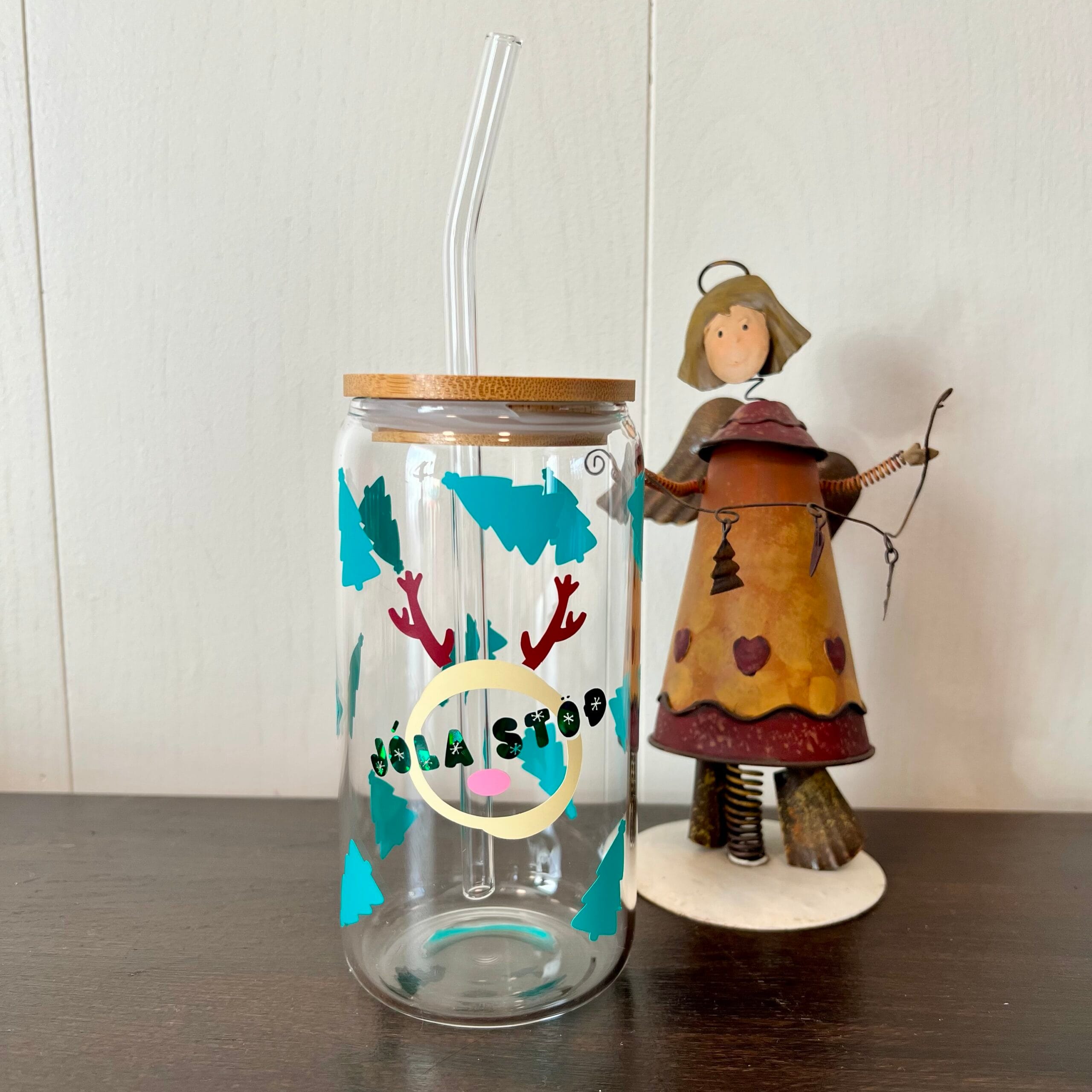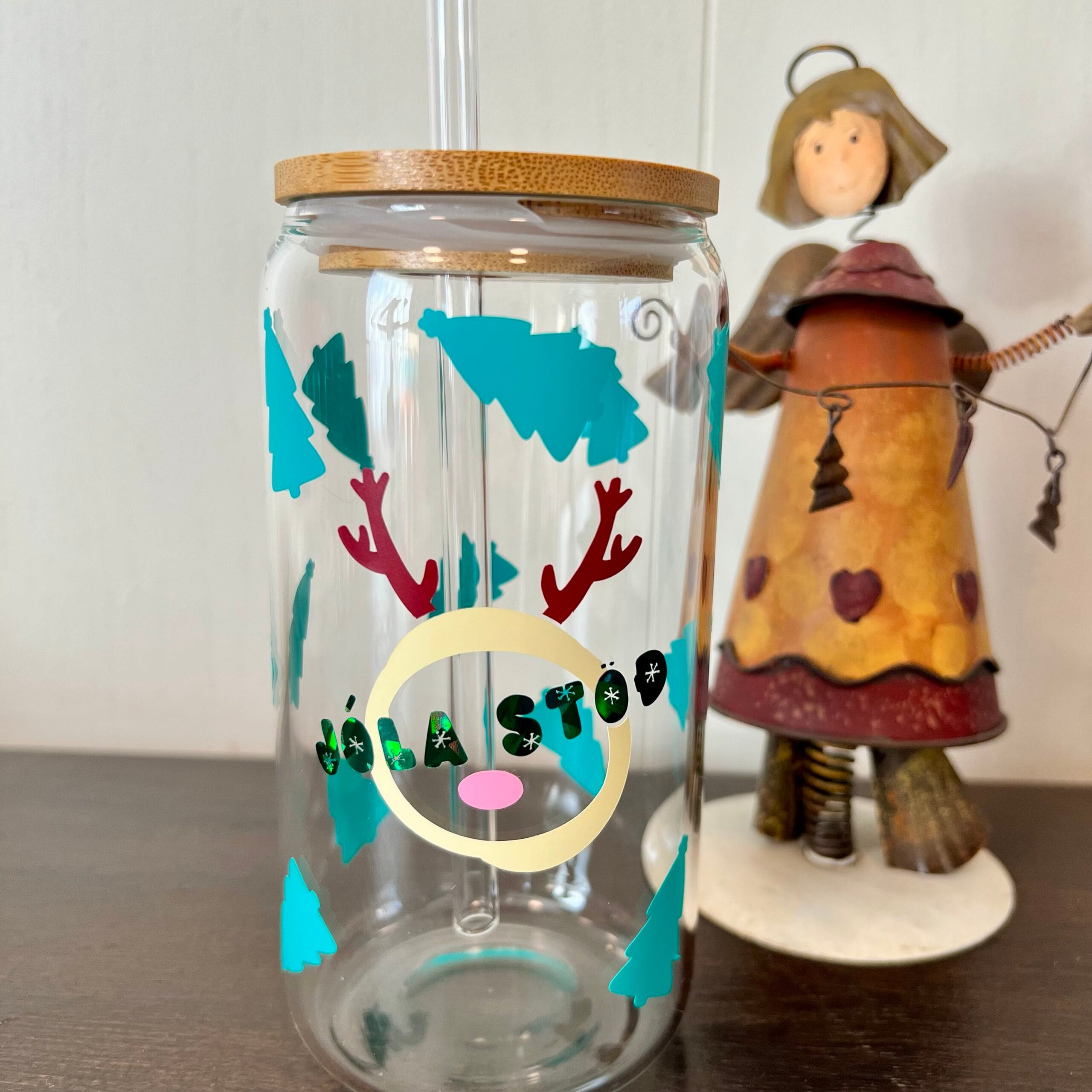 Jólakrukka með skemmtilegu dádýri og jólatrjám. Með glerstrá. ✨