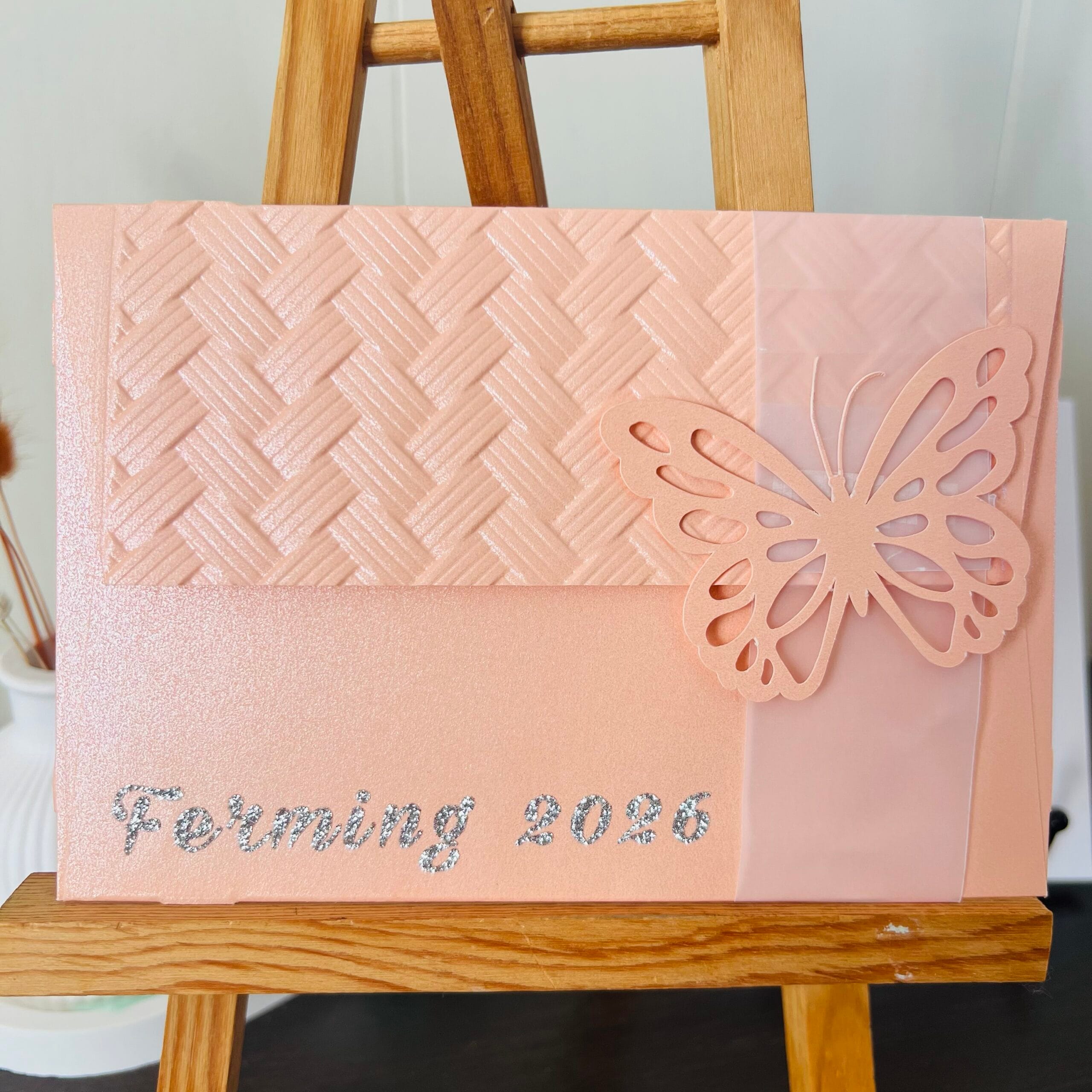 Umslagið er skreytt með fallegu fiðrildi sem er skorið út úr pappír og gefur umslaginu léttan og rómantískan svip ✨