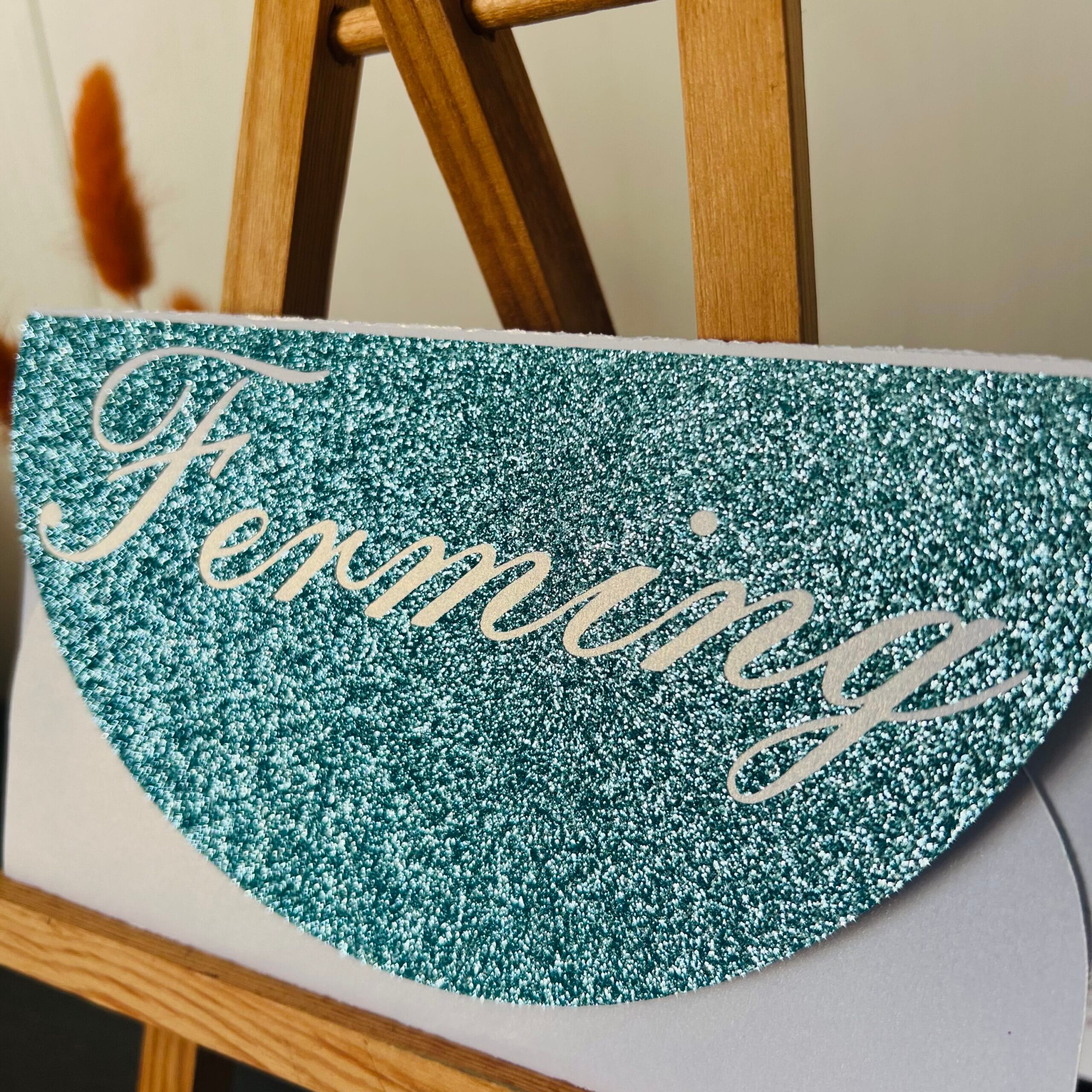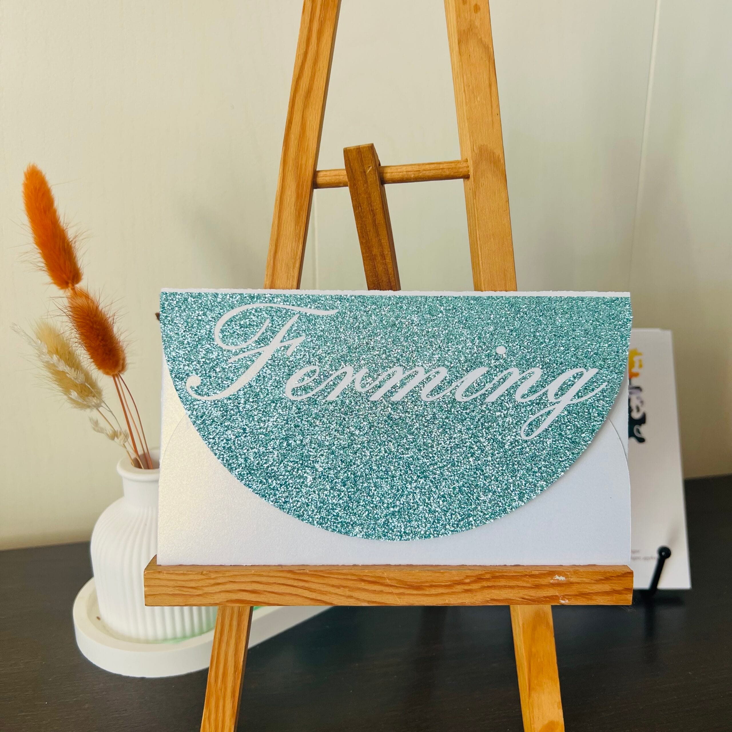 Á umslaginu er glitrandi áletrun „ferming” úr bláum glitter-vinyl sem gefur því hátíðlegan og nútímalegan svip ✨