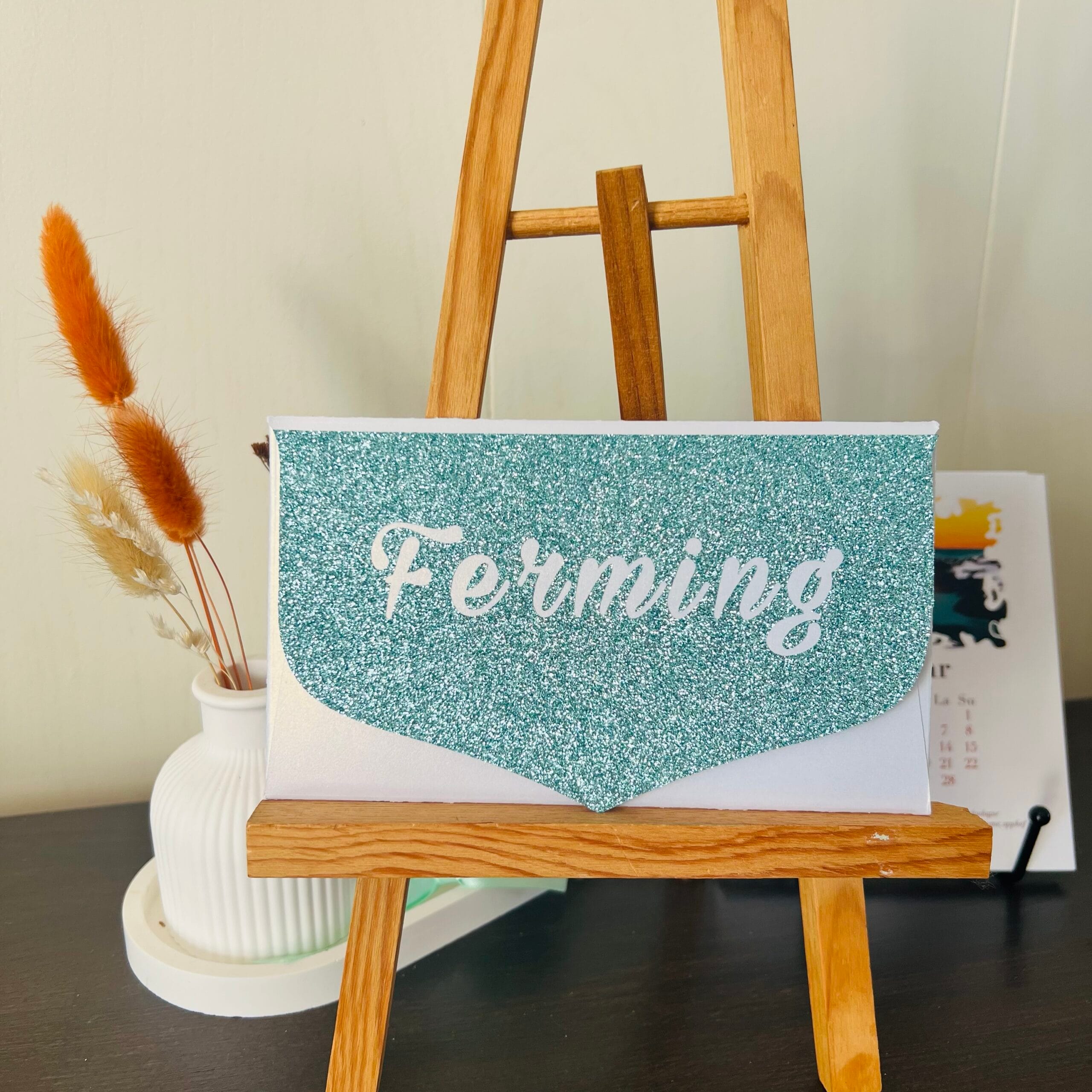 Á umslaginu er glitrandi áletrun „ferming” úr bláum glitter-vinyl sem gefur því hátíðlegan og nútímalegan svip ✨