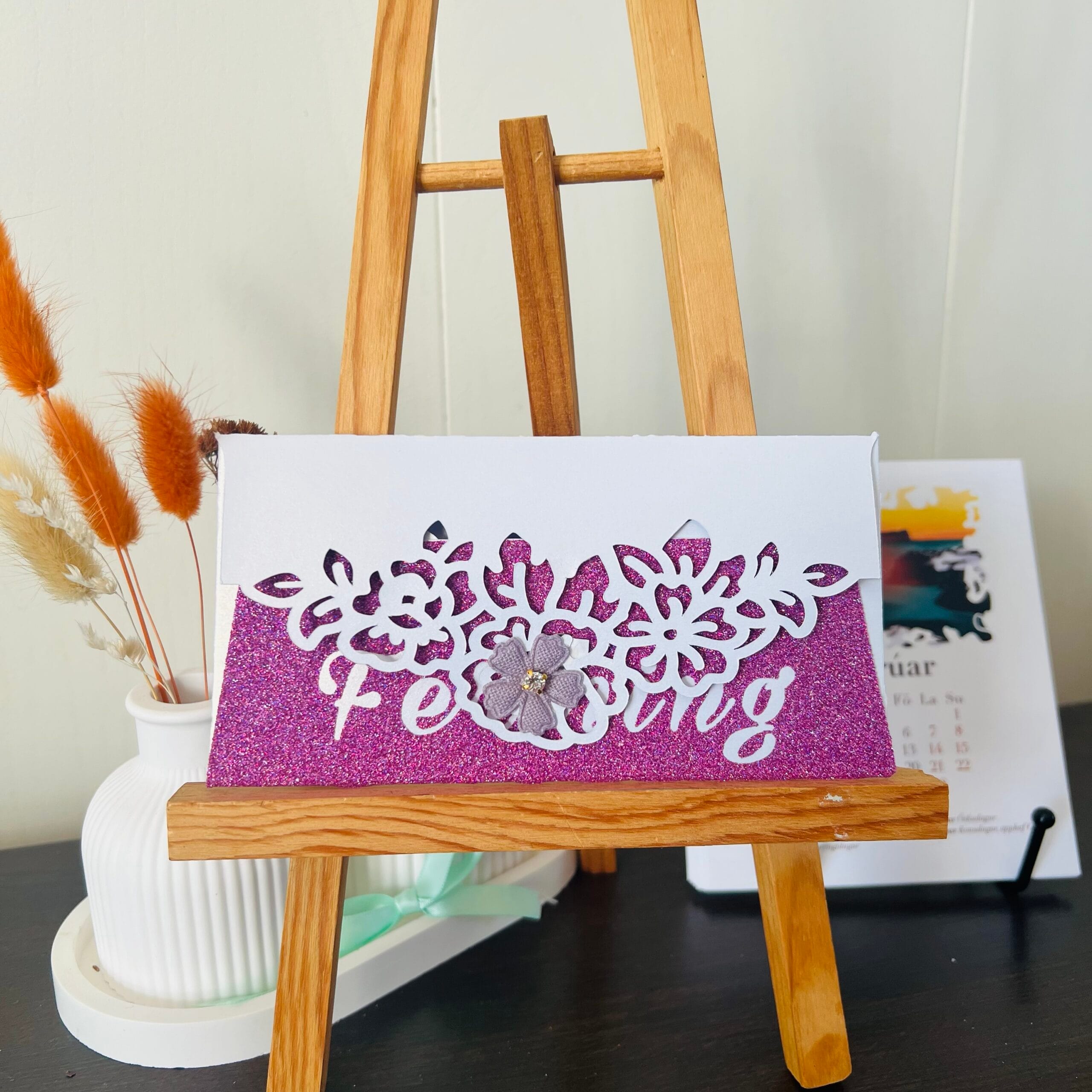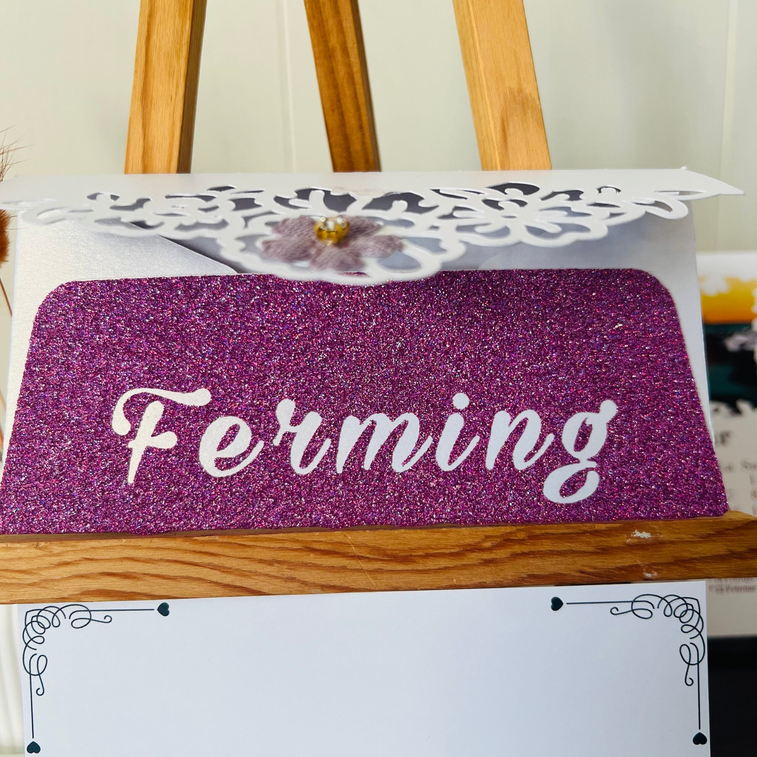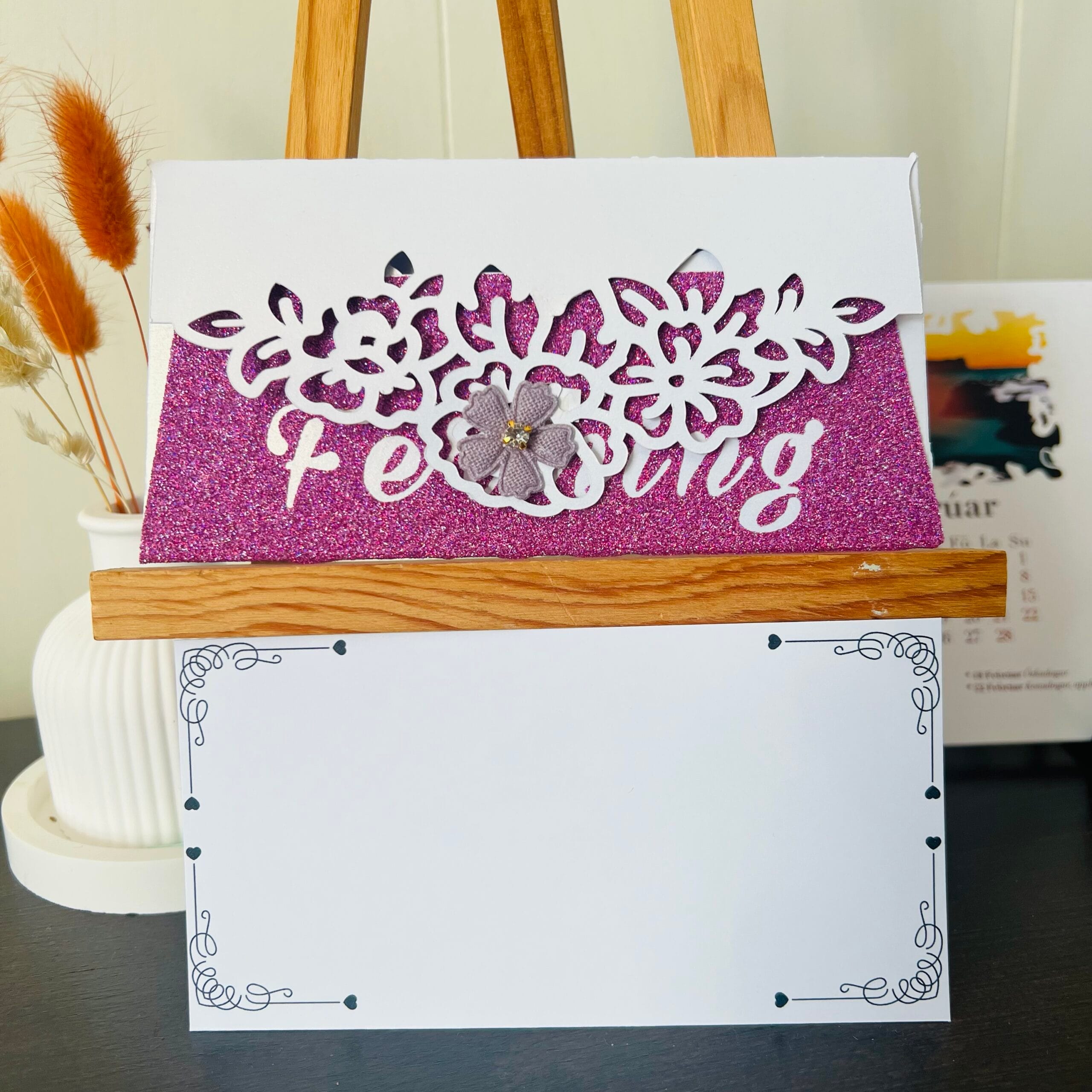 Á umslaginu er glitrandi áletrun „ferming” úr bleikum glitter-vinyl sem gefur því hátíðlegan og glæsilegan svip ✨