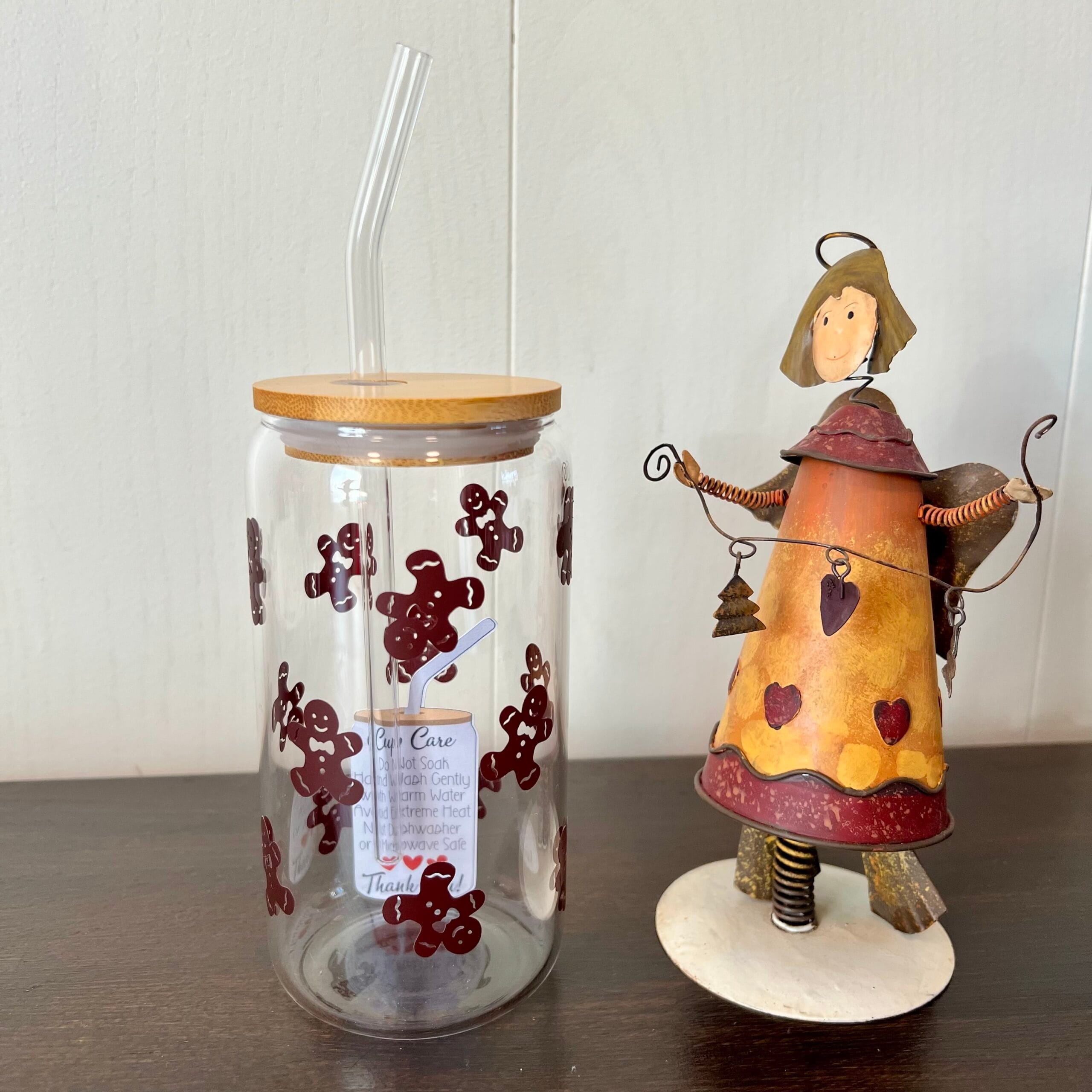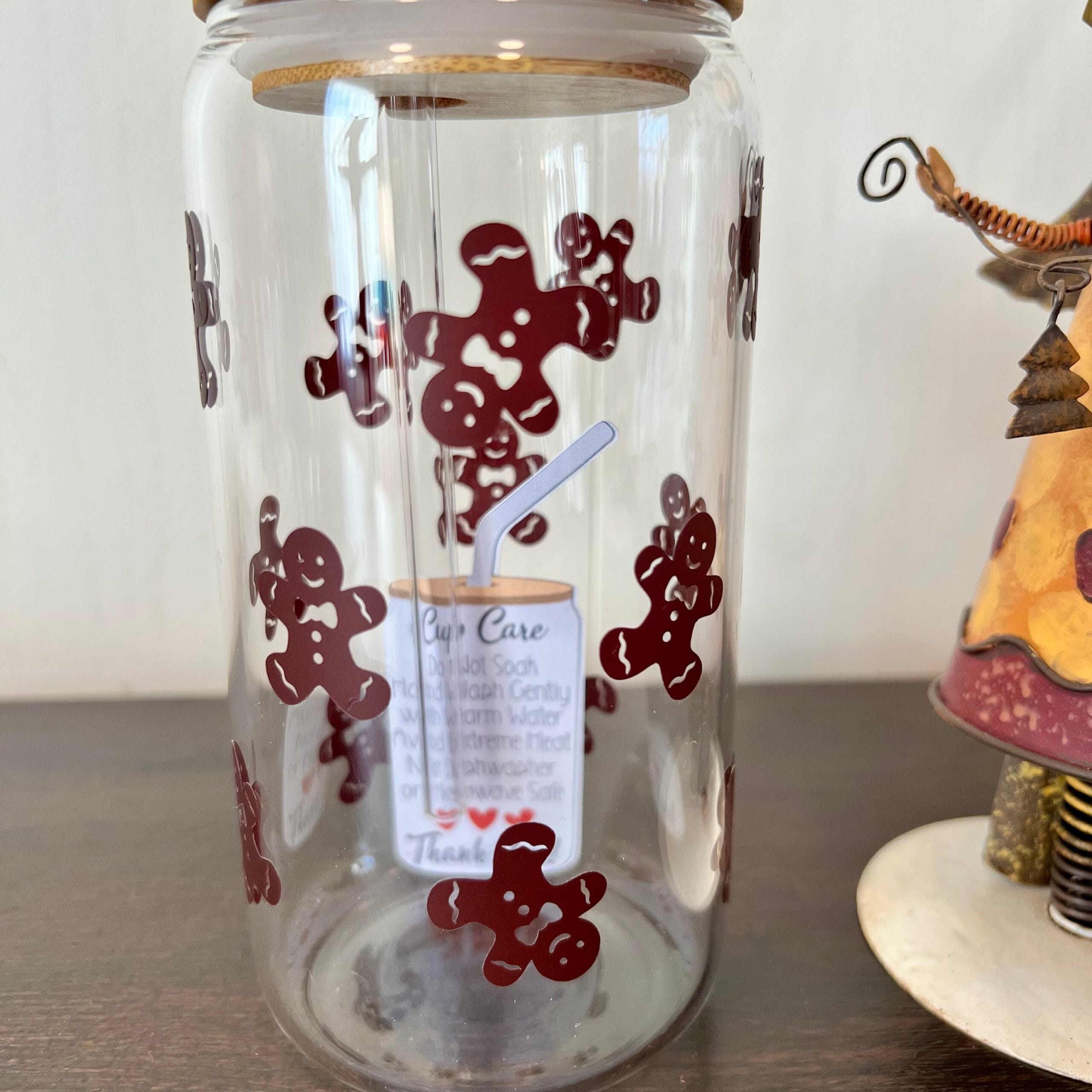Falleg glerkrukka skreytt með sætum piparkökum sem ganga allan hringinn — eins og jólasætindi sem faðma drykkinn þinn.
