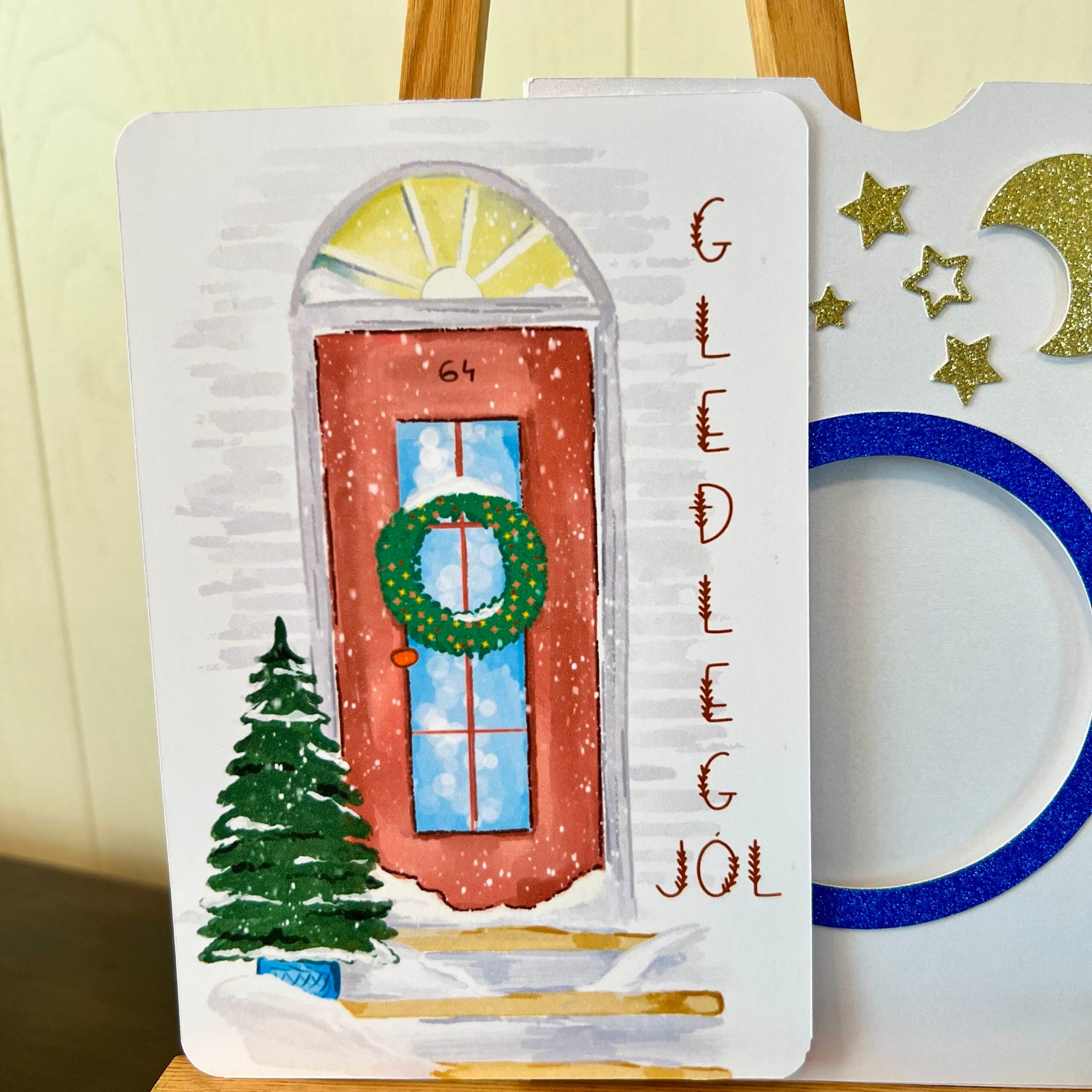 + SendingarkostnaðurHandgert vetrarkort með vatnslitamynd af hurð, snjó og jólatré. Pláss fyrir hlýjar óskir.