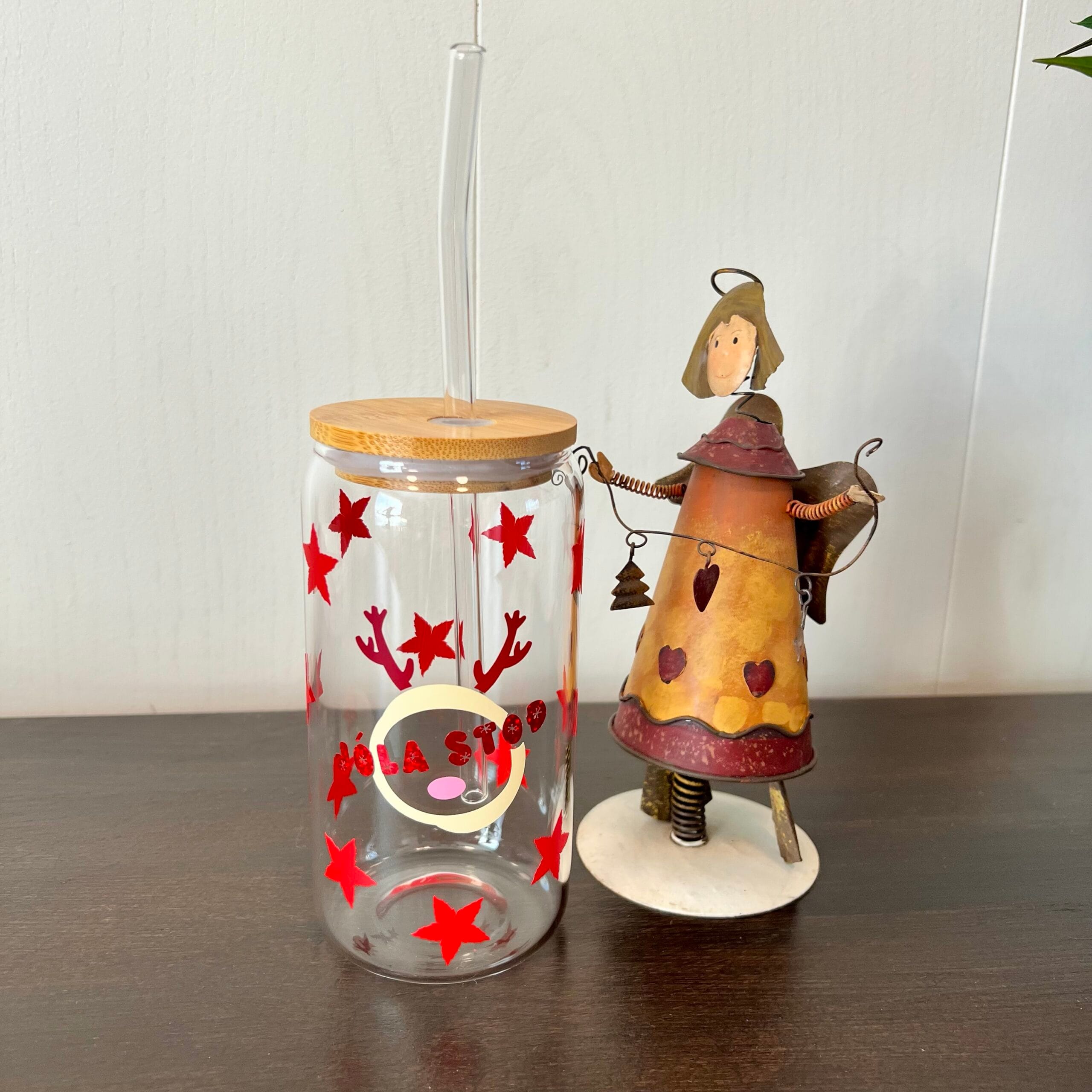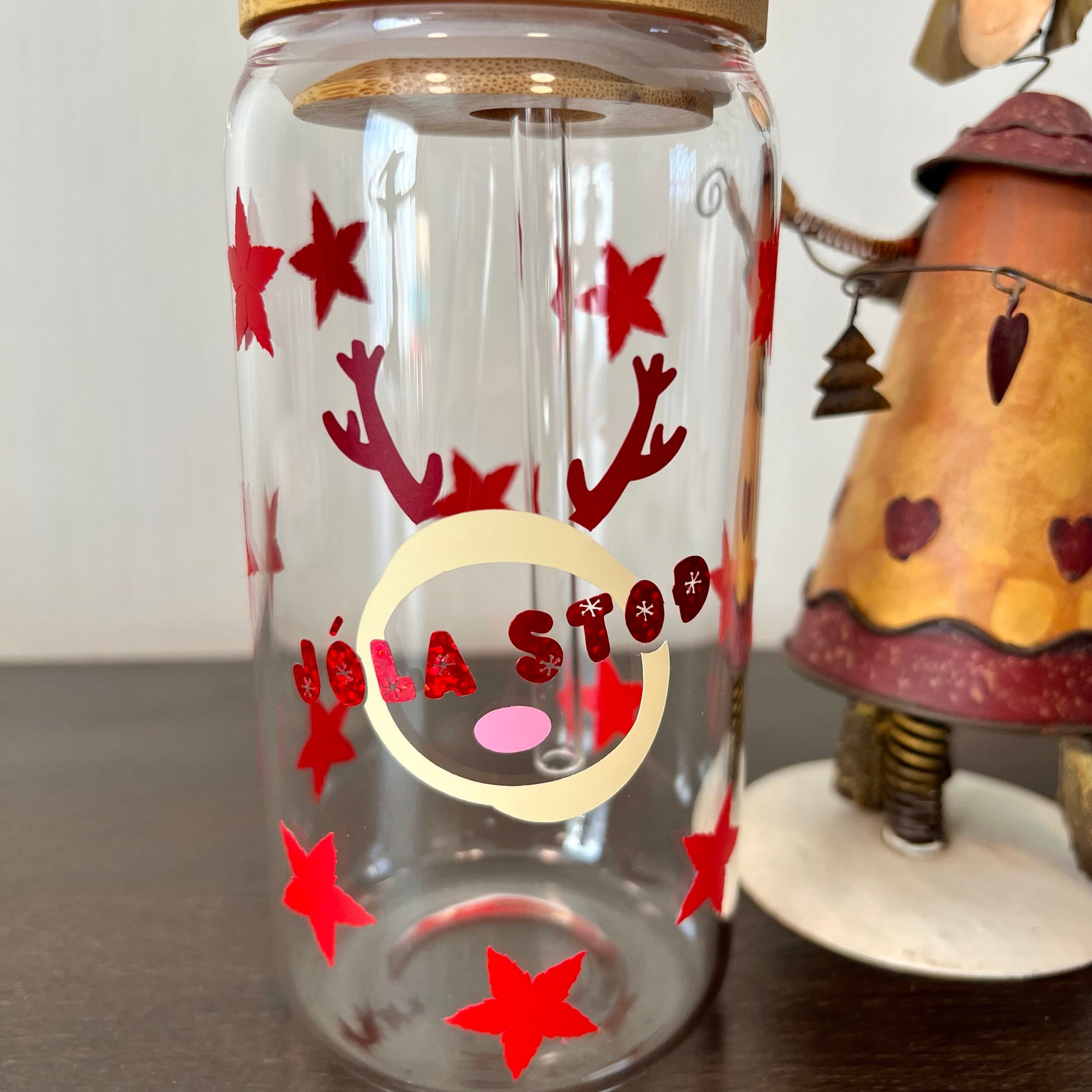 + SendingarkostnaðurJólakrukka með rauðum stjörnum og dádýri „Jóla stöð“. Með glerstrá. ✨