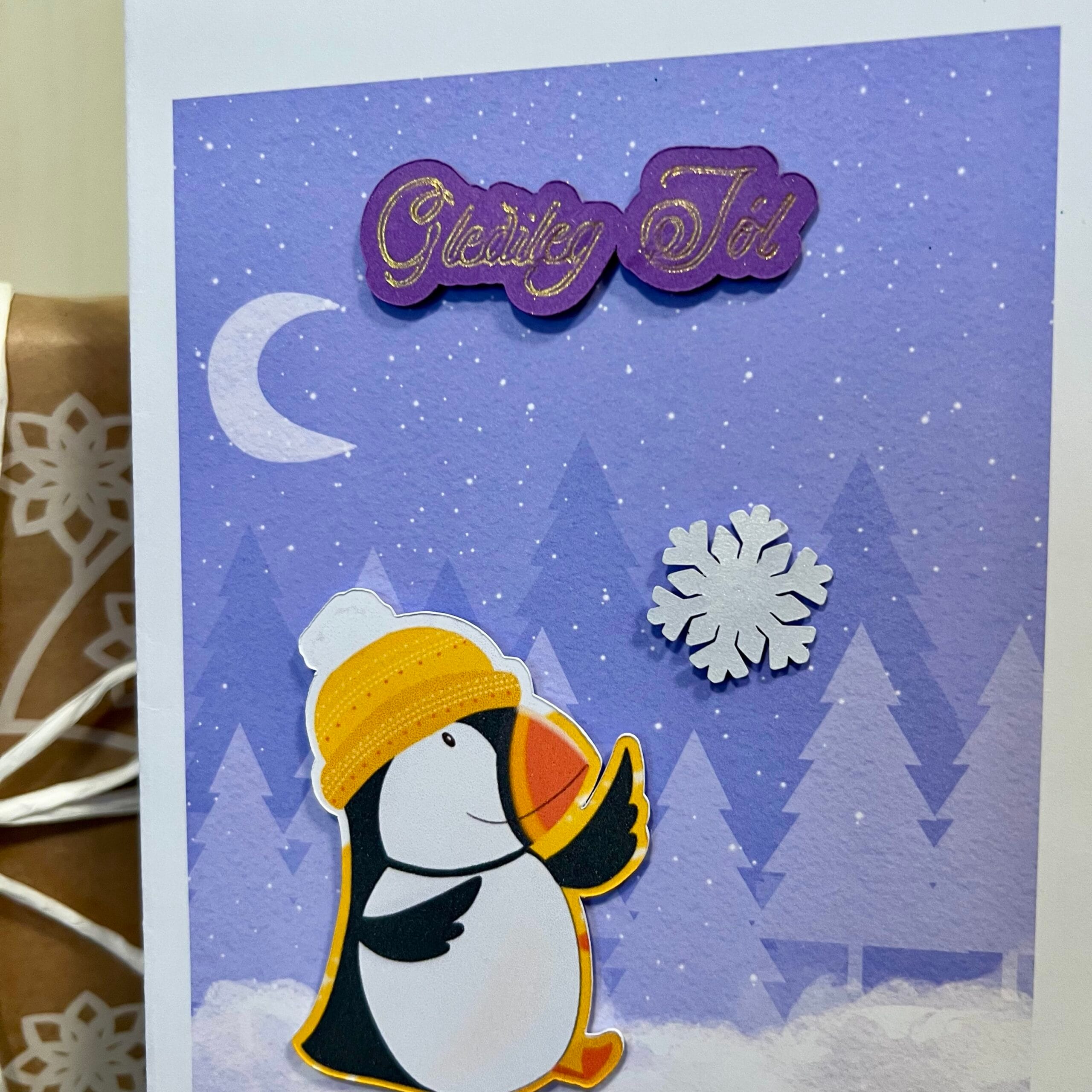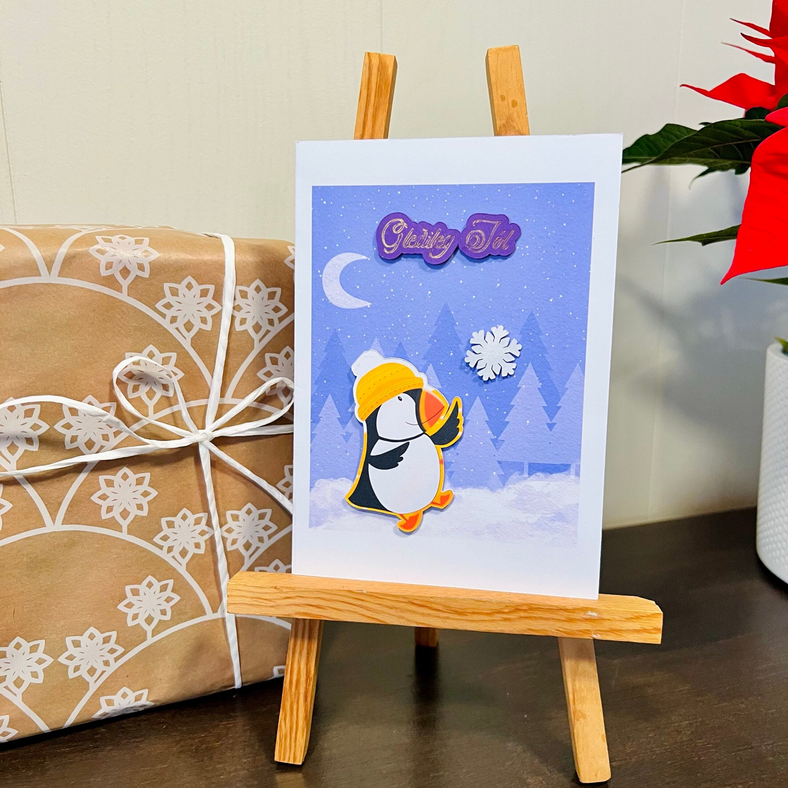 + SendingarkostnaðurJólakort með lundi sem reynir að ná snjókorni í vetrarskógi. ❄️🐧✨