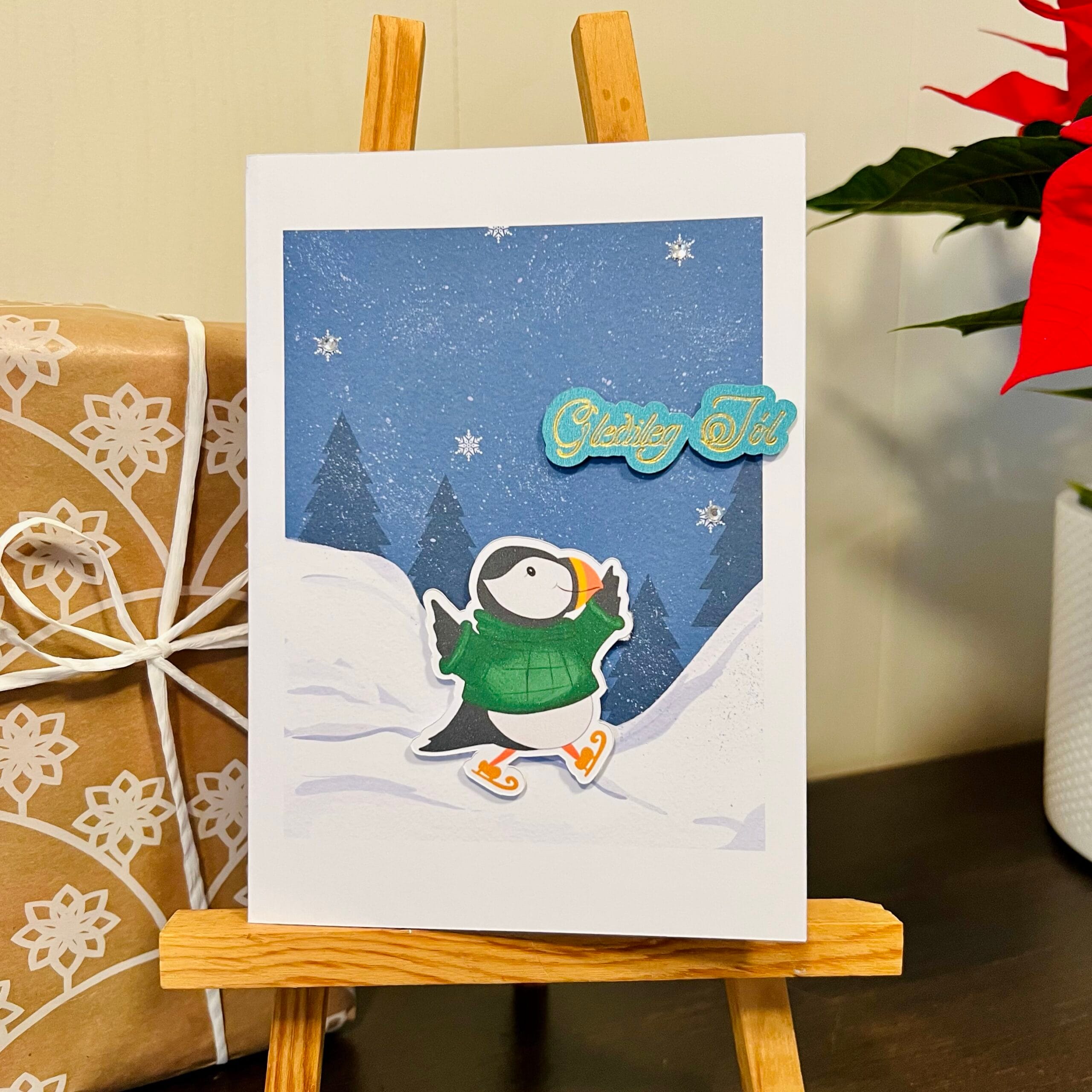Þessi jólakort sýnir dásamlegan lundi í hlýjum jólaserpu að renna sér á skautum í snævi þöktum vetrarskógi. Falleg og notaleg stemning sem fangar gleði jólanna – fullkomið til að gleðja einhvern sérstakan eða prýða gjöfina.