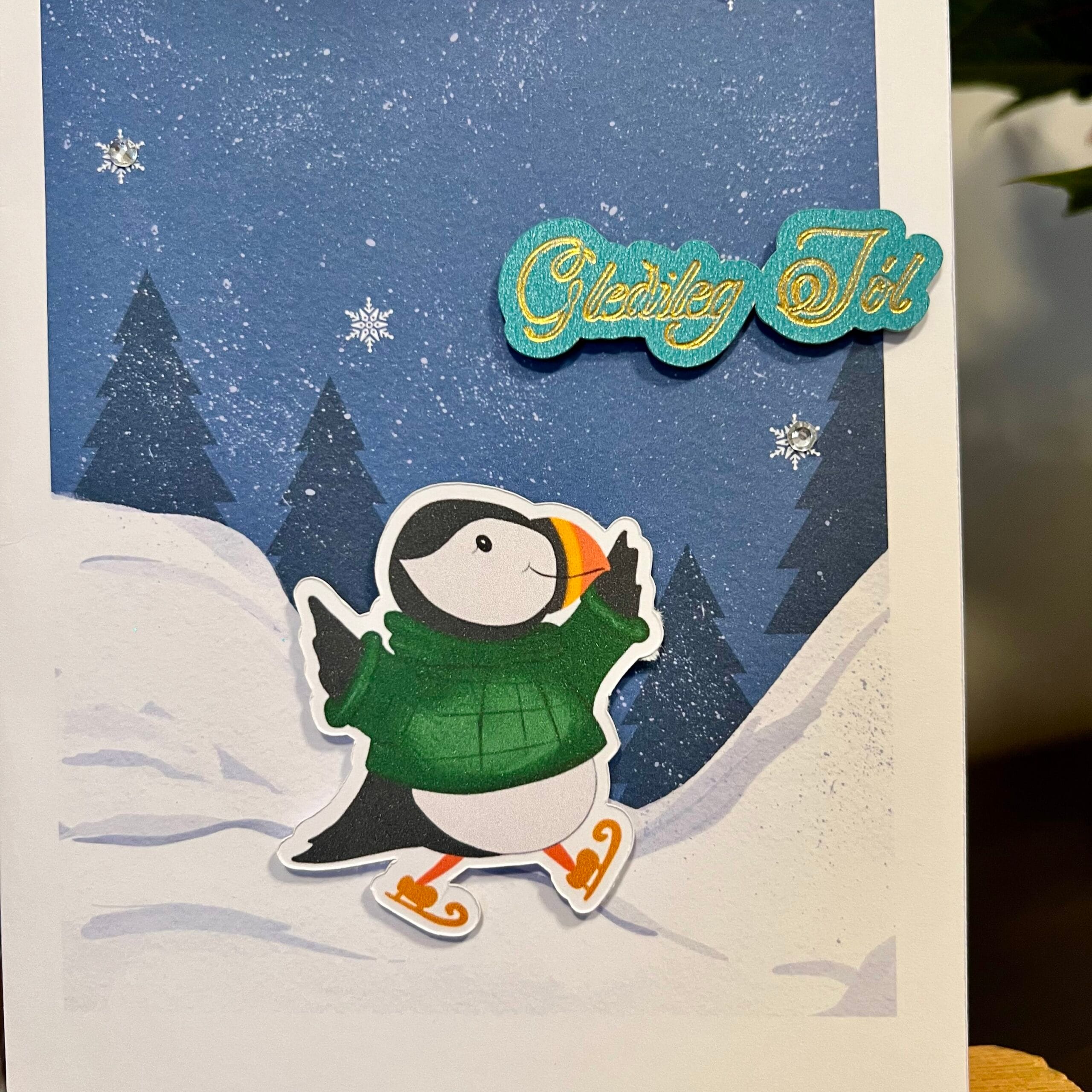 + SendingarkostnaðurVinalegt jólakort með lundi á skautum í vetrarskógi.