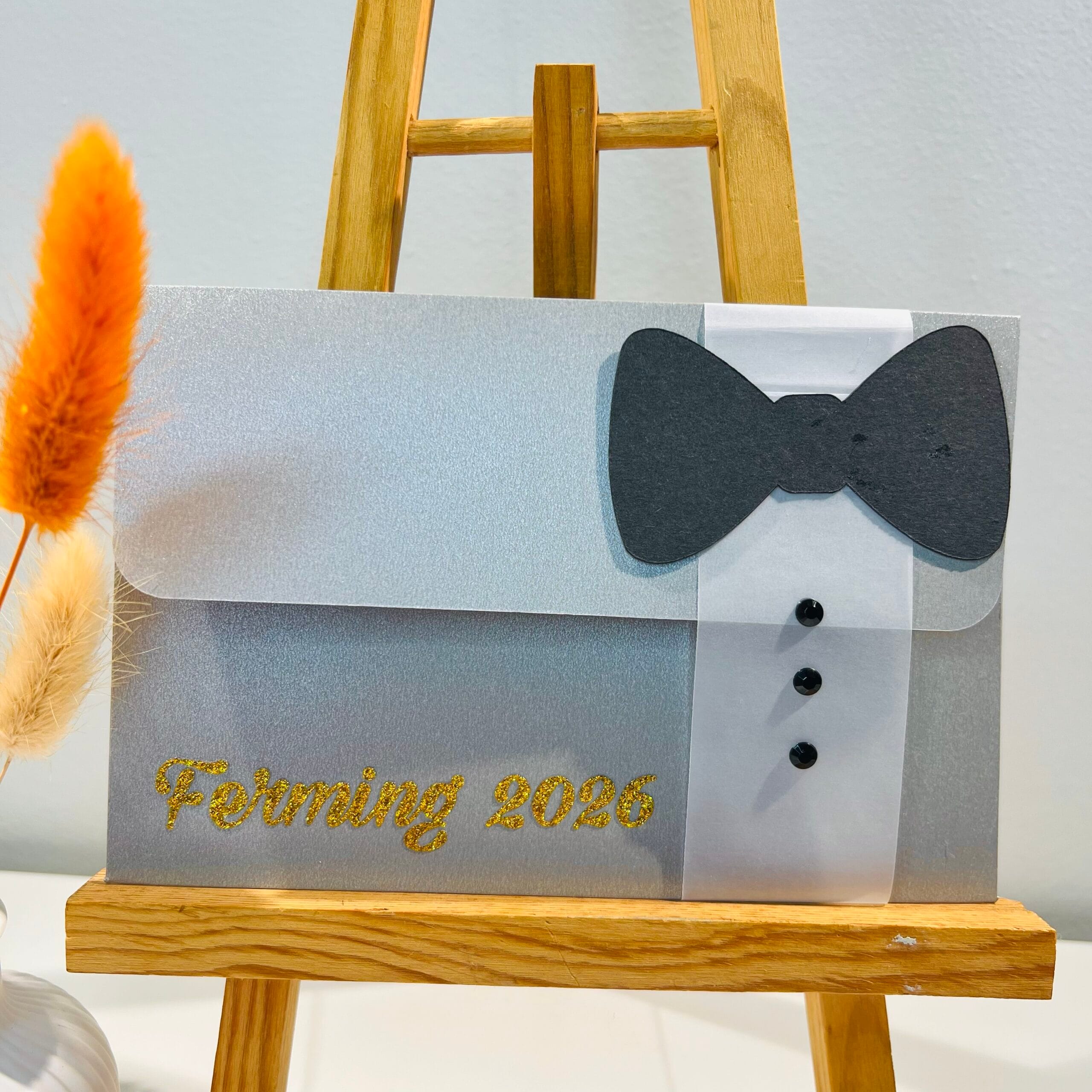 The envelope is decorated with a bow tie shape and small buttons, giving it a stylish and festive look.