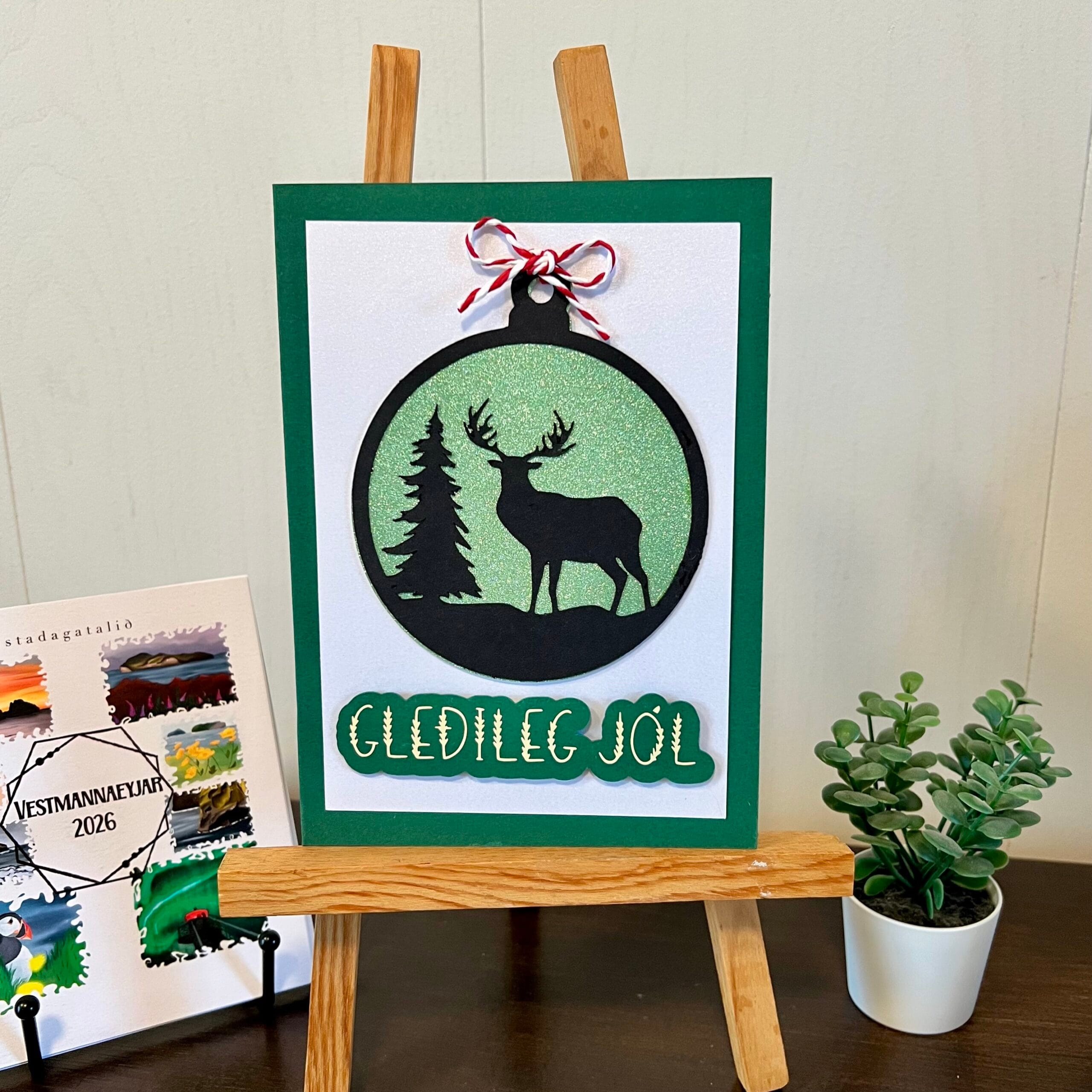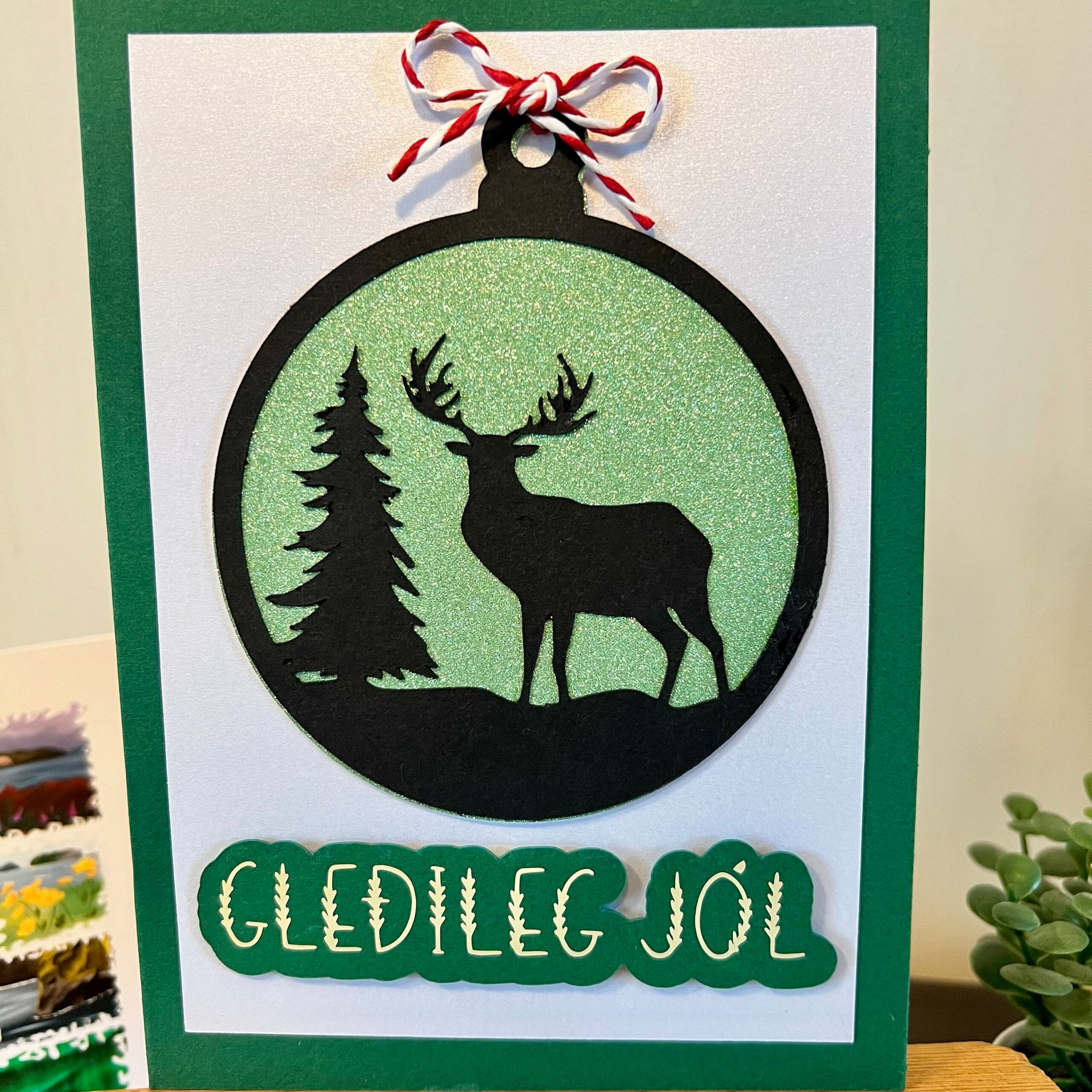 + Shipping costHandmade green Christmas card with a glitter circle, deer silhouette, and “Gleðileg jól”.