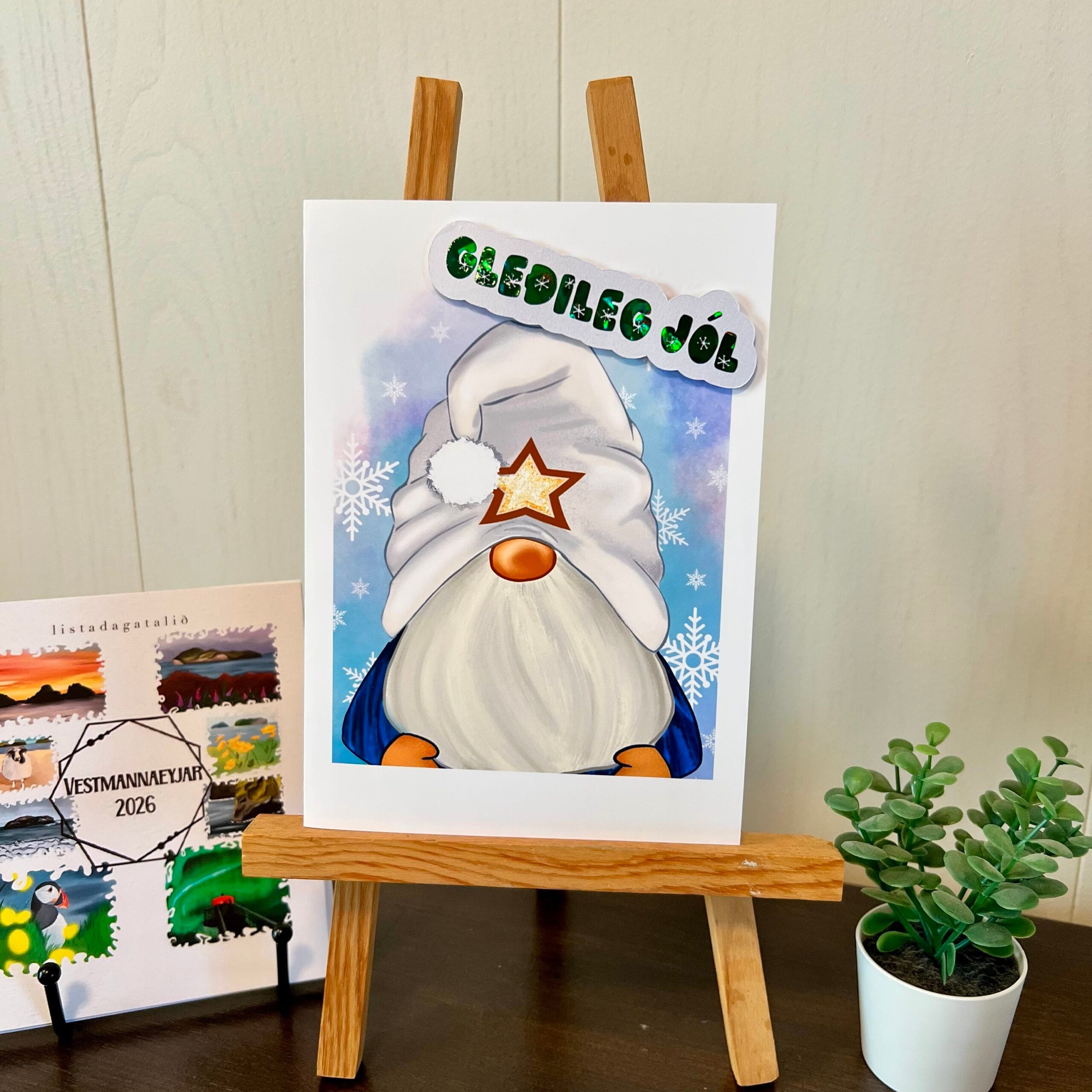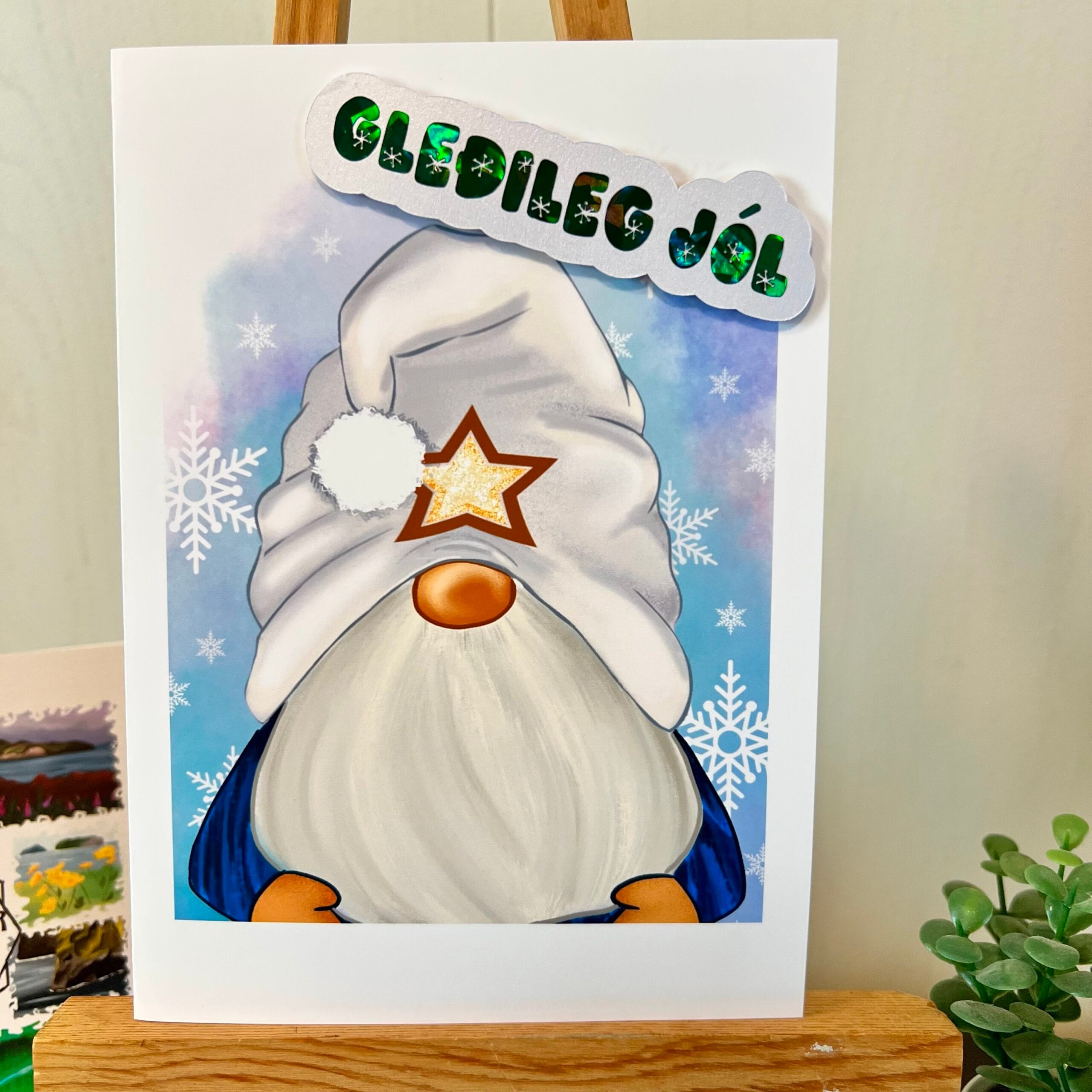 This festive card features a charming illustration of a Christmas gnome and the cheerful Icelandic greeting “Gleðileg jól”.