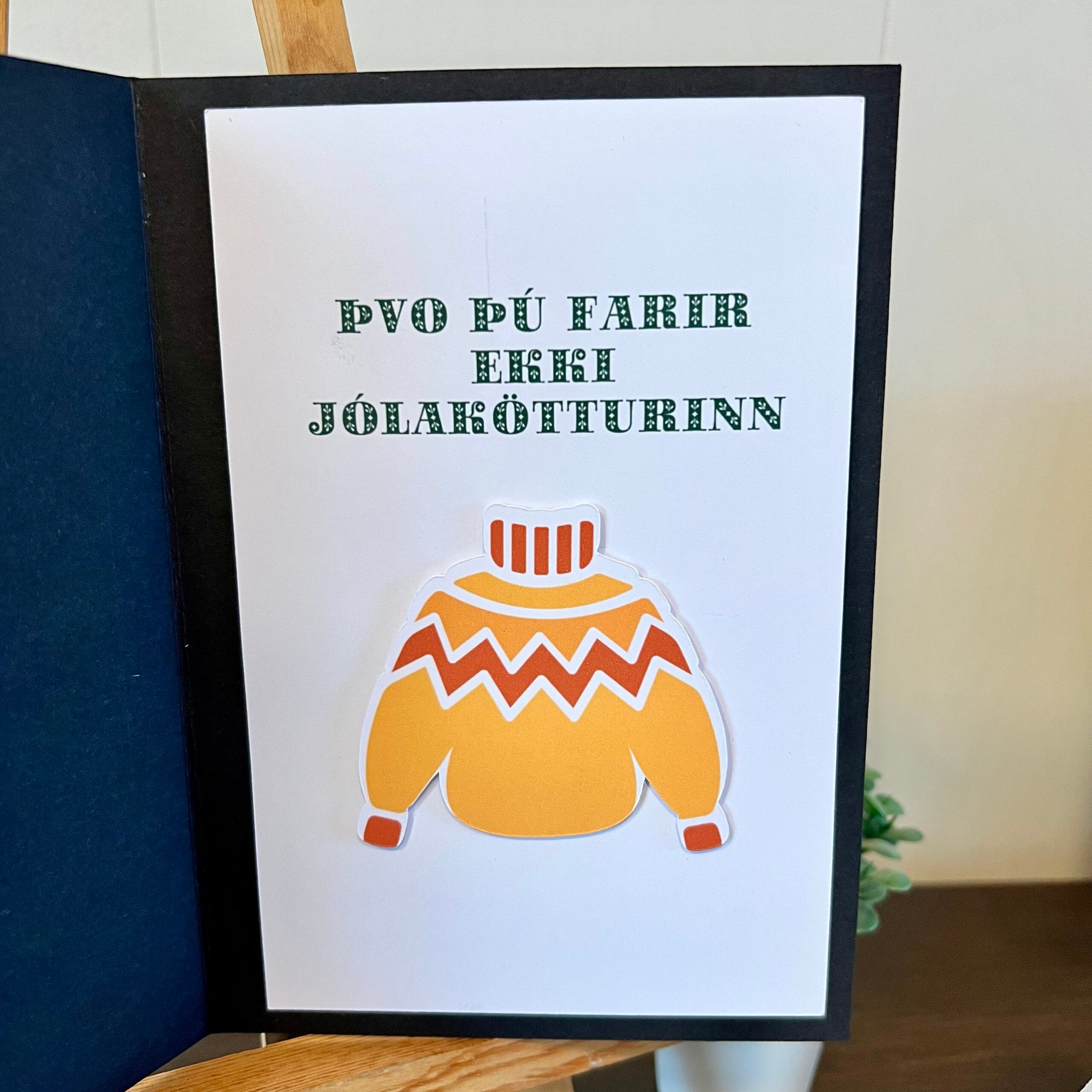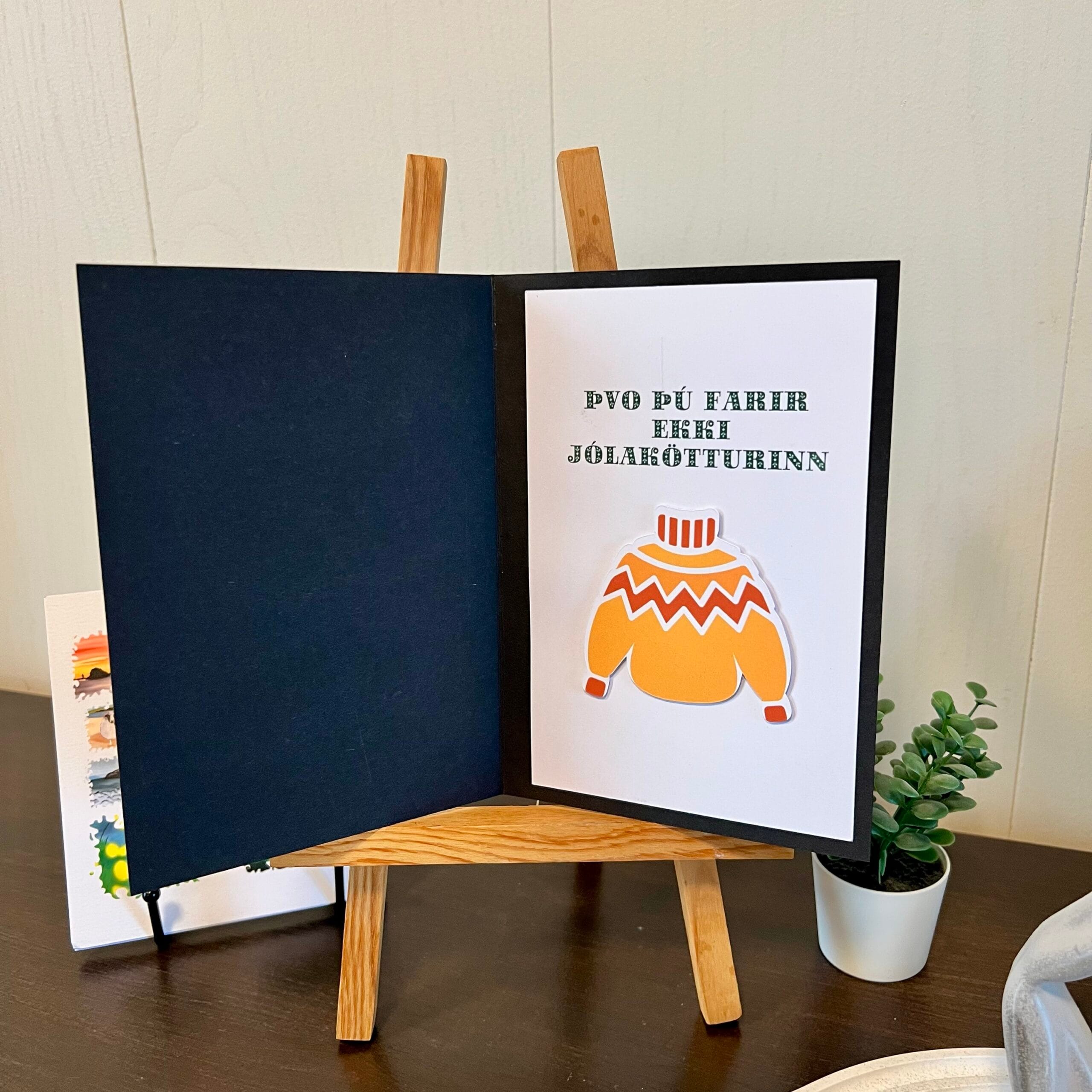 Inside, there’s a printed knitted Icelandic sweater and a festive holiday greeting, making this card a perfect blend of tradition and mystery.