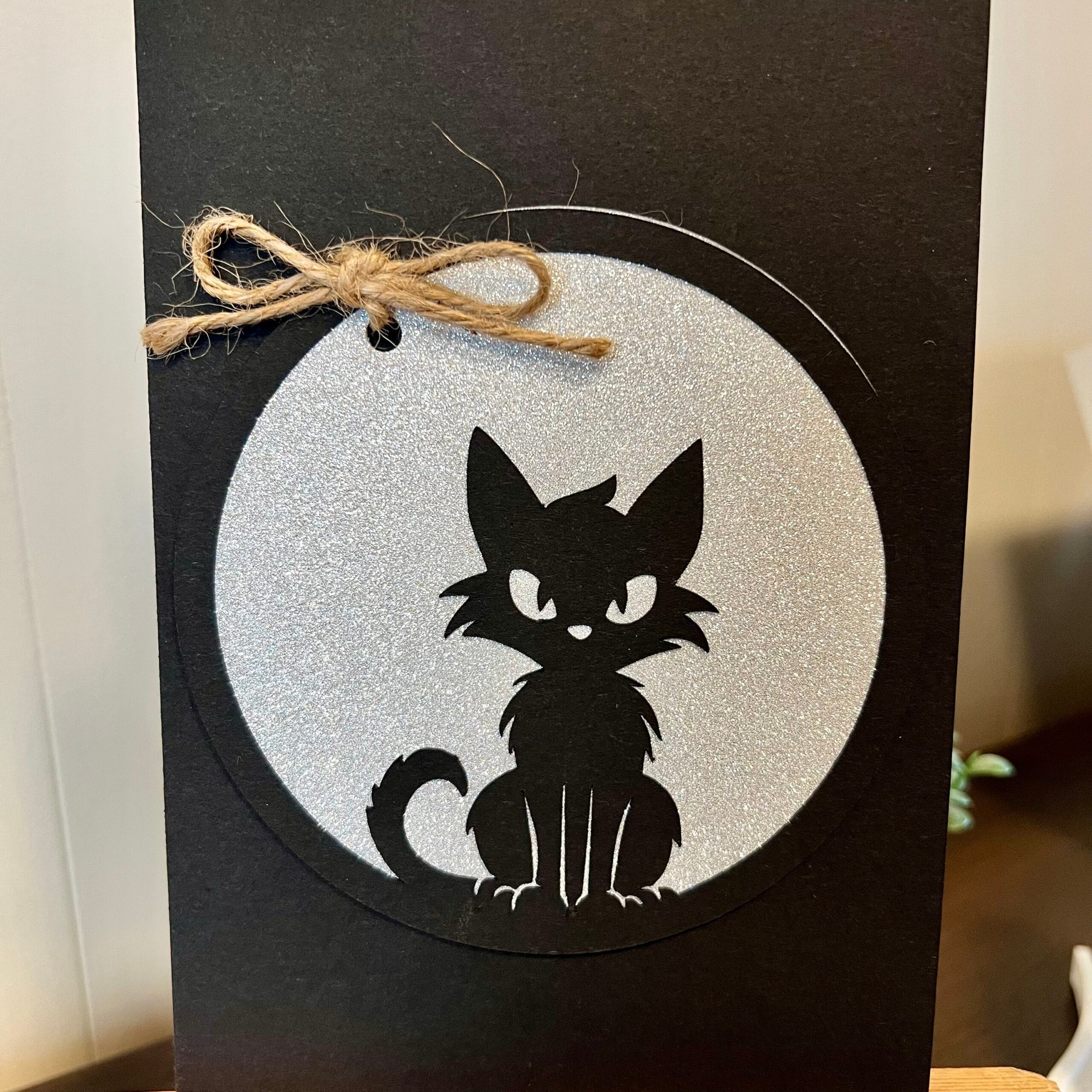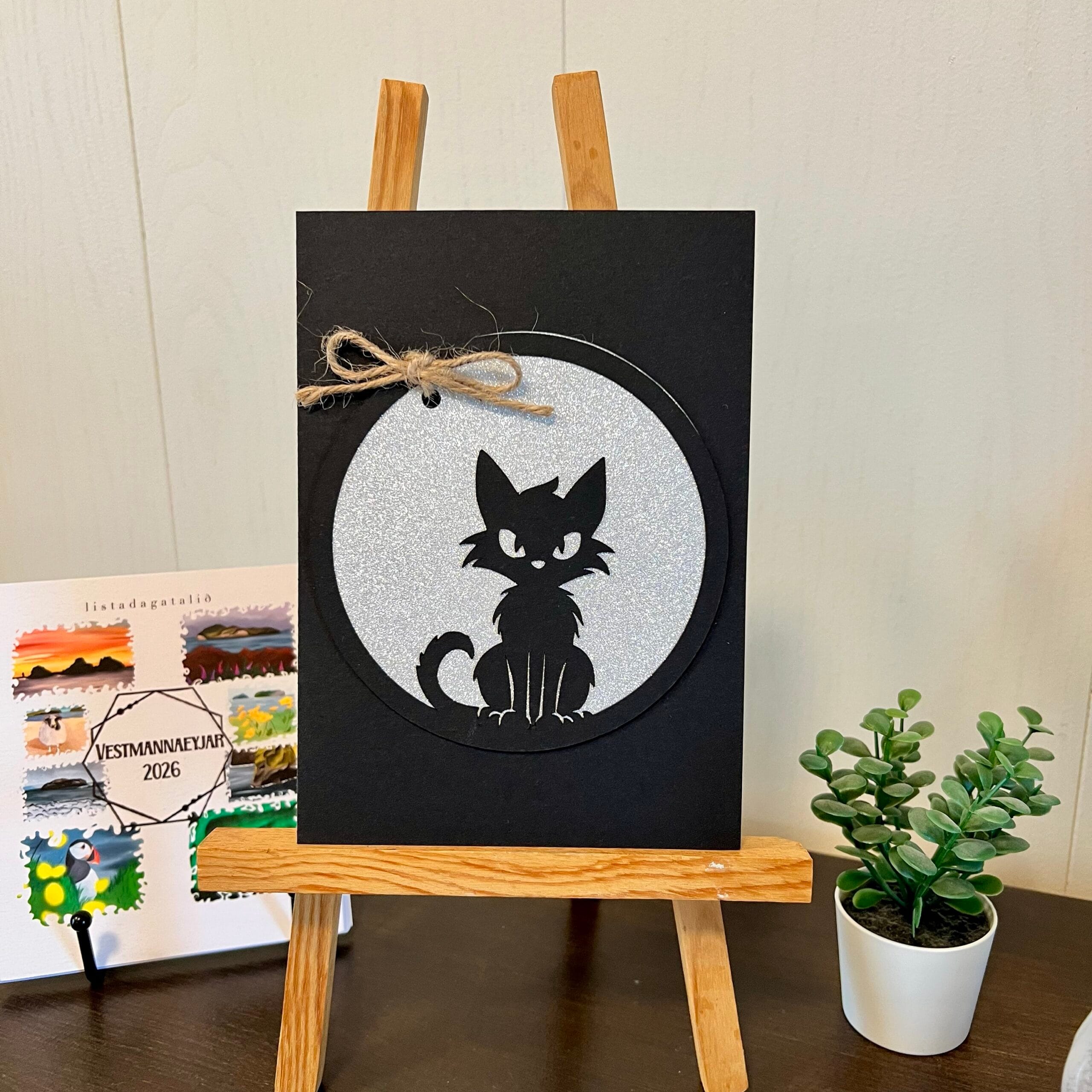 This striking card features a black base with a central black circle containing a silver glitter circle and the silhouette of the Icelandic Yule Cat — Jólakötturinn.